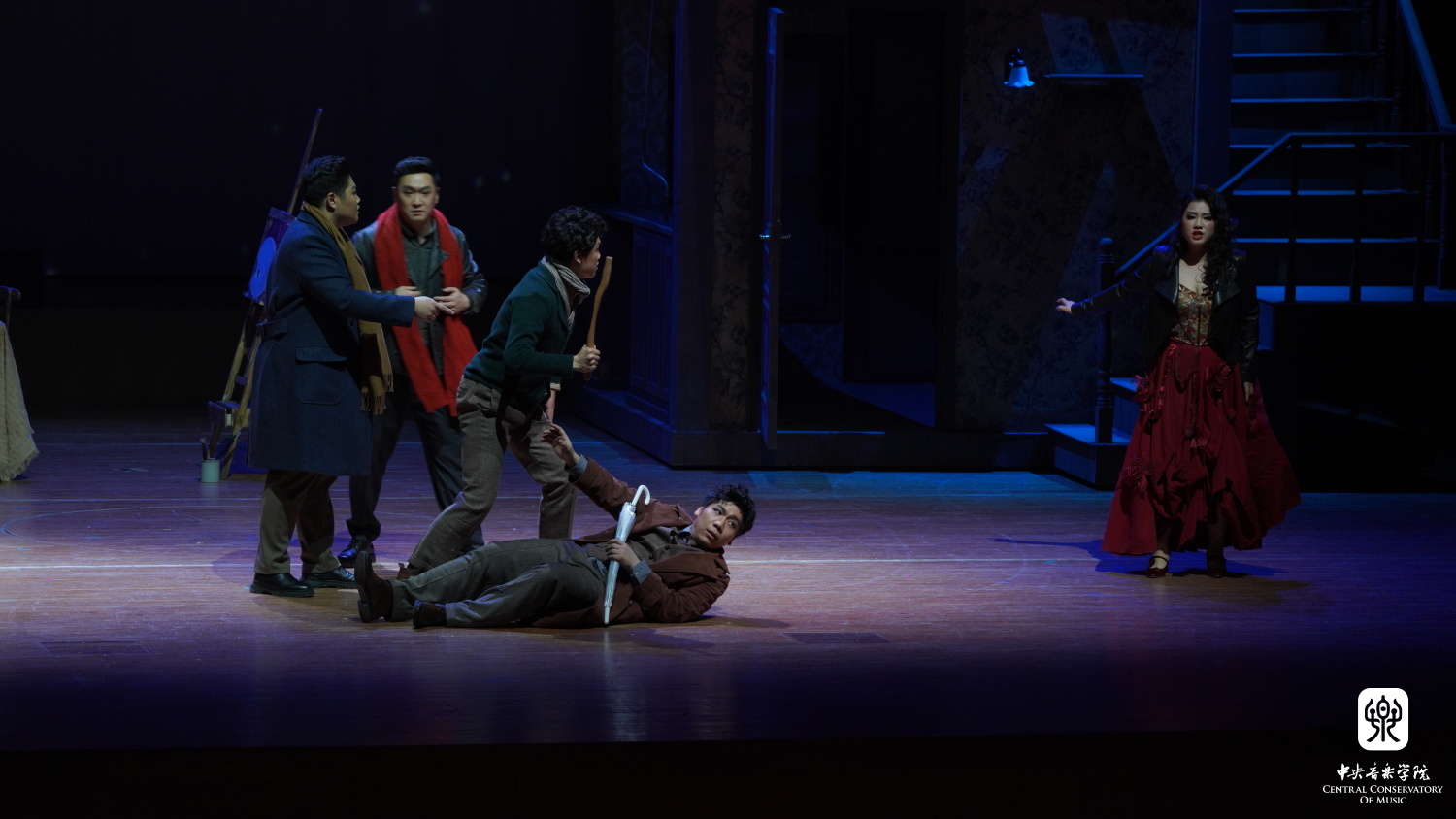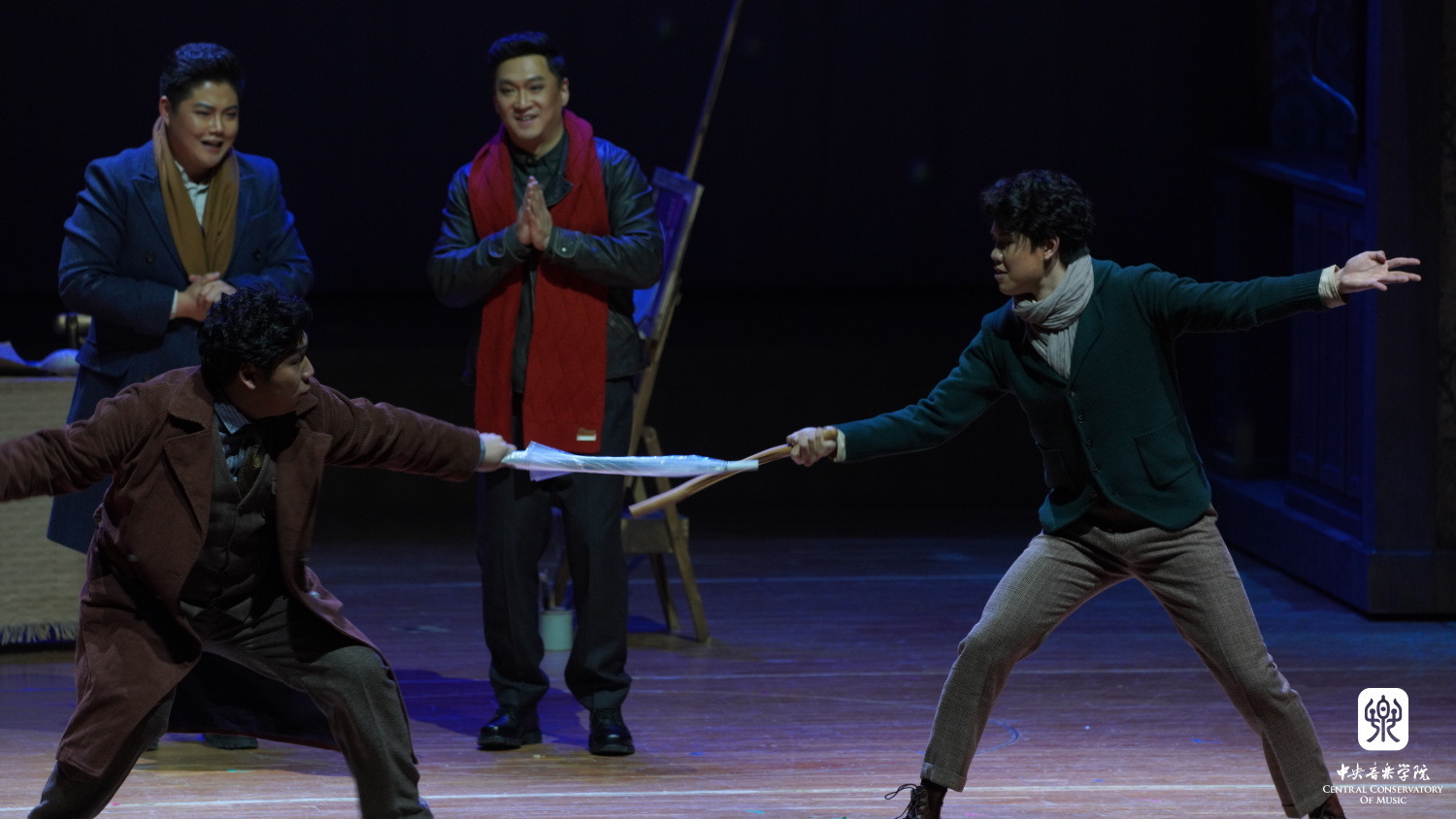 笔者观看的A组演出,由外教专家马可.贝雷依任指挥,青年教师王慧任导演,女主角咪咪、男主角鲁道夫、画家马尔切洛的扮演者分别由博士一年级和二年级的在读生扮演,音乐家舒奥纳、哲学家柯林和画家女友穆赛塔分别由研究生二年级和本科四年级在读生扮演。