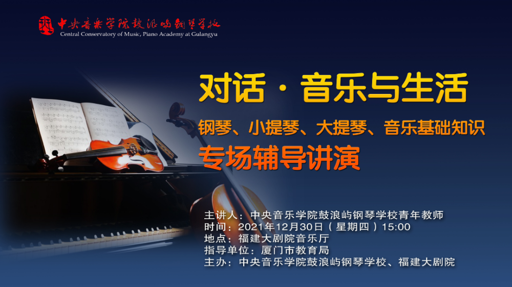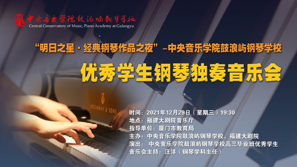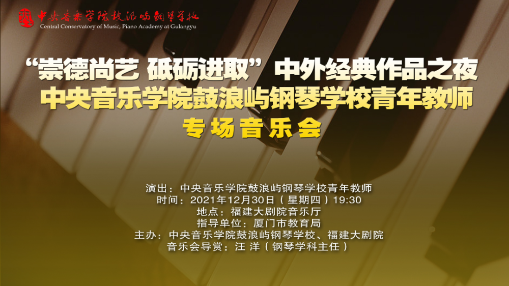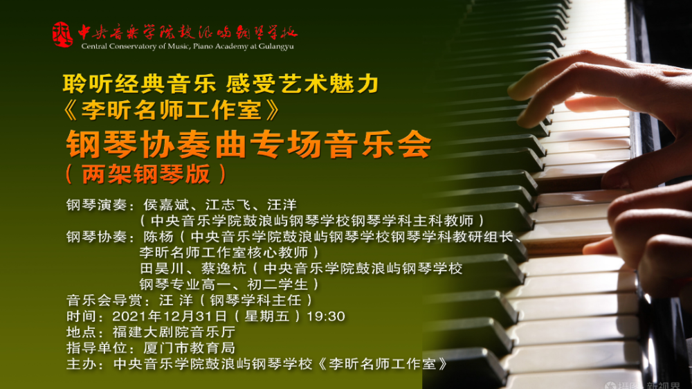 为展示学校教师岗位大练兵成果,进一步提升青年教师的业务能力和水平,给予学生更多的舞台艺术实践机会,KY开元集团官网鼓浪屿钢琴学校于12月29日-31日在福建大剧院举办三场音乐会。分别是:“明日之星·经典钢琴作品之夜”一一KY开元集团官网鼓浪屿钢琴学校优秀学生钢琴独奏音乐会、“崇德尚艺 砥砺进取”中外经典作品之夜一一KY开元集团官网鼓浪屿钢琴学校青年教师专场音乐会、“聆听经典音乐 感受艺术魅力”一一《李昕名师工作室》钢琴协奏曲专场音乐会。还有两场辅导讲演:中国意蕴·中国钢琴、声乐作品专场赏析会和“对话·音乐与生活”钢琴、小提琴、大提琴、音乐基础知识专场辅导讲演。本次活动由厦门市教育局指导,KY开元集团官网鼓浪屿钢琴学校和福建大剧院联合主办。