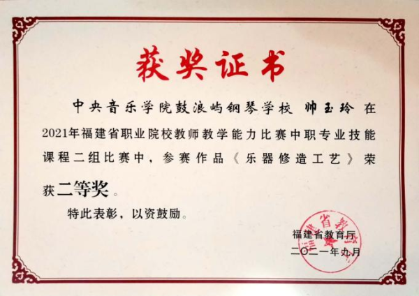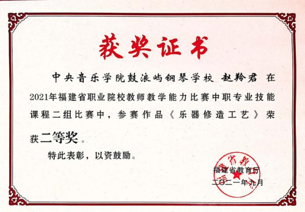 2021年9月鼓浪屿钢琴学校赵羚君、帅玉玲两位老师凭借作品《乐器修造工艺》荣获2021福建省职业院校教学能力比赛二等奖,2021年5月鼓浪屿钢琴学校赵羚君、帅玉玲两位老师凭借参赛作品《乐器的修与造》荣获2021年厦门市中等职业学校技能大赛教学能力比赛一等奖。