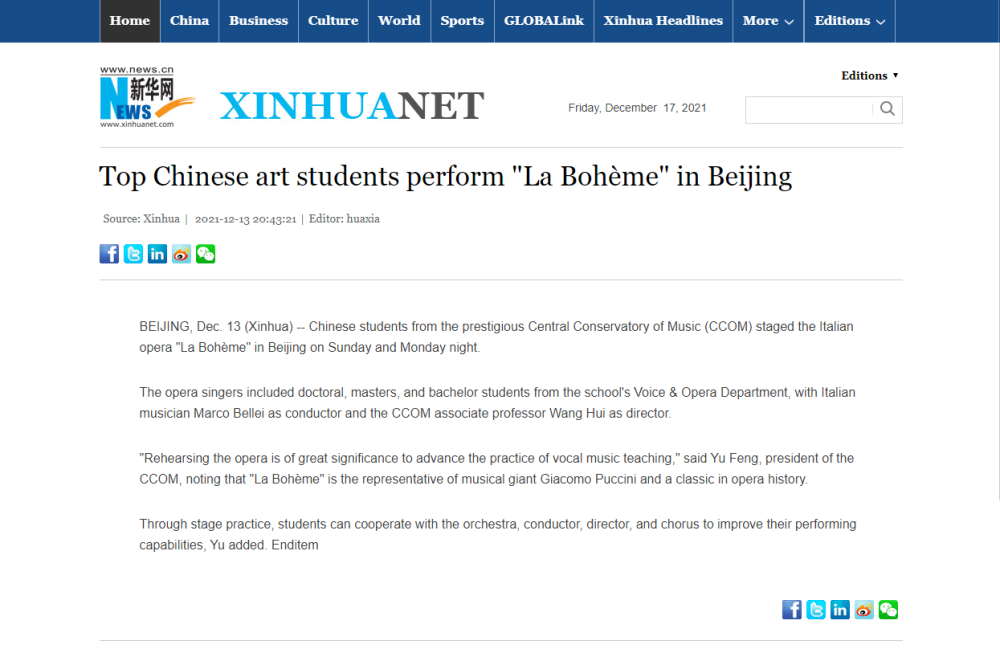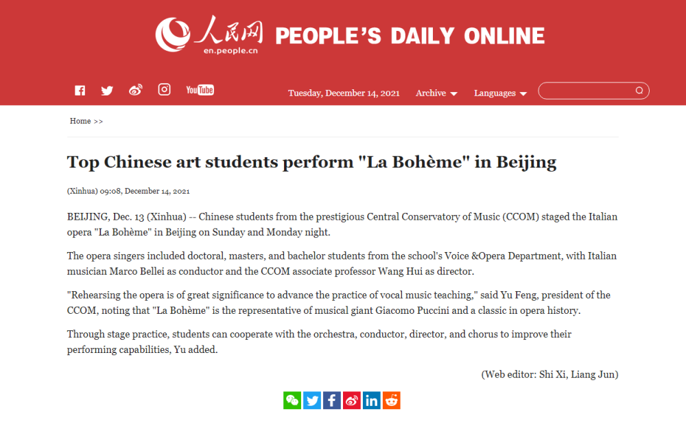 这场被观众称之为“整个冬天最温暖的演出”,整体给人唯美浪漫的感受,尤其舞台布景的优美、人物的鲜活细腻,打动人心。演出后的反响热烈,不仅刷屏朋友圈,还吸引了新华网、人民网等媒体的关注,纷纷以英文和意大利语方式广泛传播。被观众称为这个冬天里“最温暖”的演出!