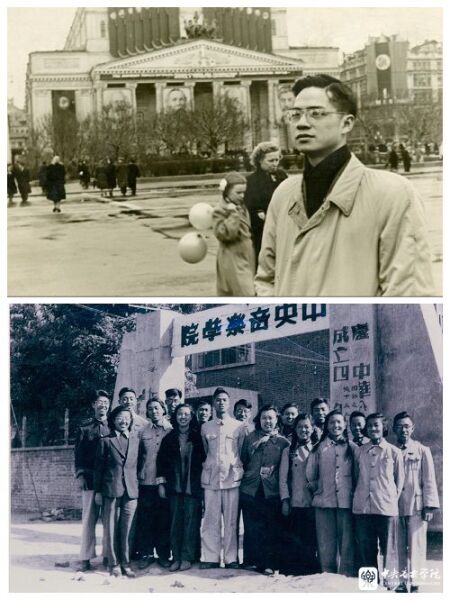 下,1954年,杜鸣心(前排左4)留苏前与青年团小组的同志们在音乐学院大门前合影。