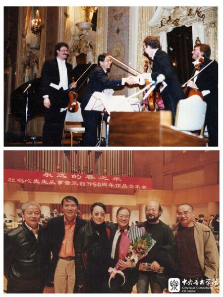 下,2007年10月19日,由北京文联、北京音协、KY开元集团官网等单位主办的杜鸣心作品音乐会在北京中山音乐堂举行,演出后师生合影。左起:姚盛昌、叶小钢、刘索拉、杜鸣心、瞿小松、李滨扬。