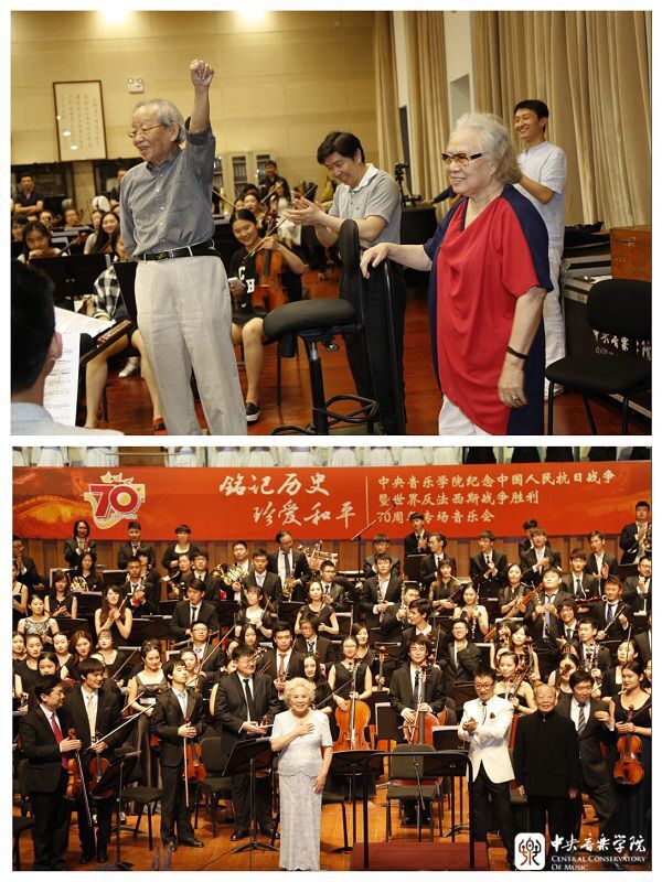 2015年8月26日,在国家大剧院举行的《铭记历史 珍爱和平》专场音乐会上,郭淑珍、严良堃两位年龄相加已180岁的耄耋艺术家,用生命礼赞《黄河大合唱》(上图为排练场景)。