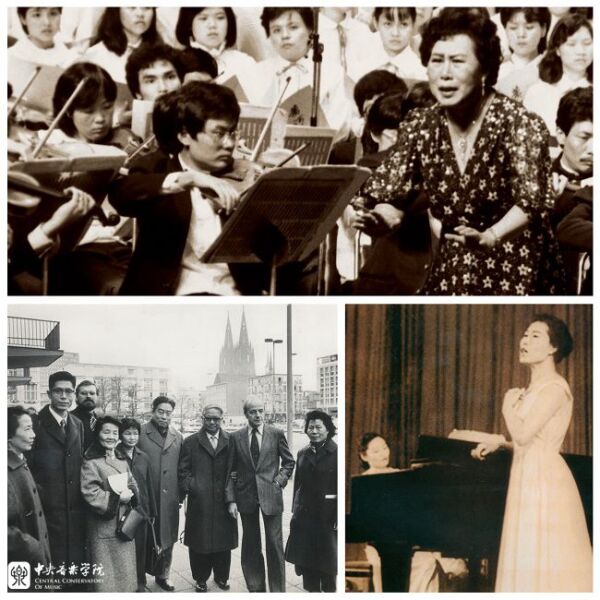 下左,1977年,郭淑珍(右1)随中国艺术家代表团访问联邦德国,与刘诗昆(左2)合作演唱《黄河怨》,赵沨院长(右3)任代表团团长。