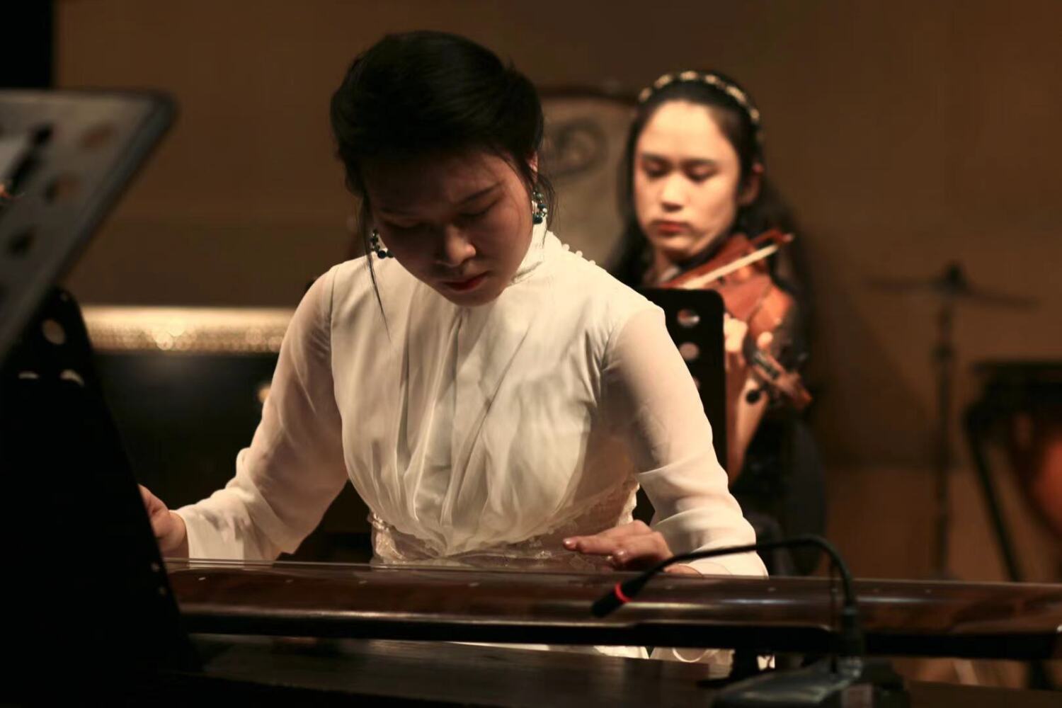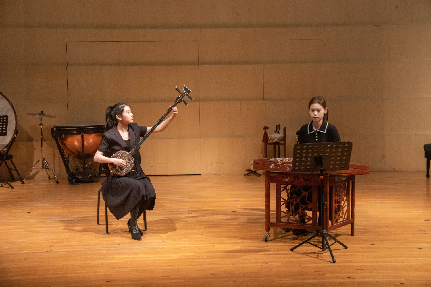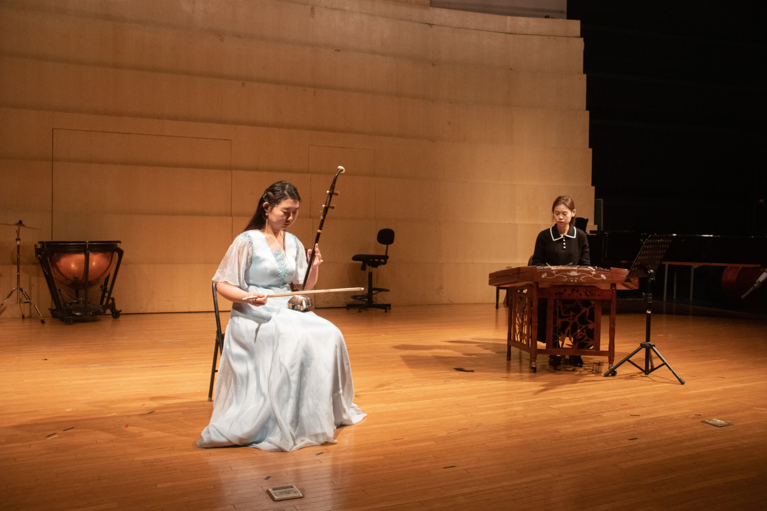 第二首曲目《打虎上山》由徐翌婷演奏三弦、刘弘婕演奏扬琴,《智取威虎山》本是现代京剧,在本场音乐会选用京剧乐队四大件中的弹拨乐器之一——三弦配合扬琴演奏,别有一番韵味。