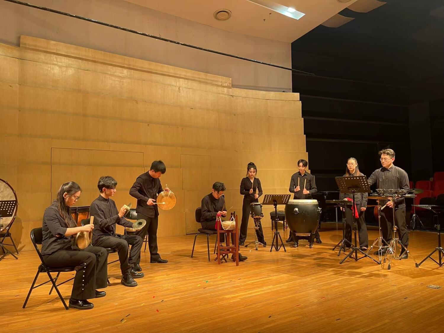 第三首曲目《三五七》是赵松庭 1957 年根据浙江婺剧乱弹唱腔改编而成的同名笛子独奏曲,曲名出自曲牌《忆江南》的词格。竹笛由大一的裴云秀同学独奏,与刘虹佑、韩淇凇、林柏村、李沐樨、李思佳、居涵榕、段智怡七位同学共同演奏。
