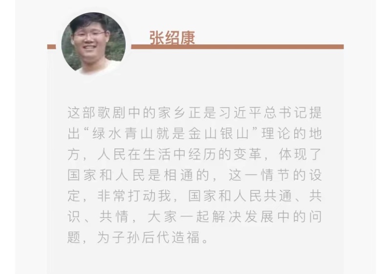 该部歌剧是中央歌剧院作为庆祝建党百年舞台艺术精品创作工程重点扶持项目,讲述了改革开放时期“三农”变化的故事。这部具有鲜明时代特征的歌剧,无论从题材、戏剧性再到演员的精彩演绎,都深深吸引了同学们。特别是剧中主要角色都是由声歌系已毕业或在读学生担任,他们饱满的激情、精湛的演唱,把感天动地、前赴后继的大爱演绎得非常震撼动人。同学们不仅在专业上有所收获,进一步感受到舞台创作需要怎样优秀的演员,更让大家再一次接受了党史教育,特别是对改革开放时期有了更深入更详细的了解和认识。看完演出之后,同学们纷纷有感而发。