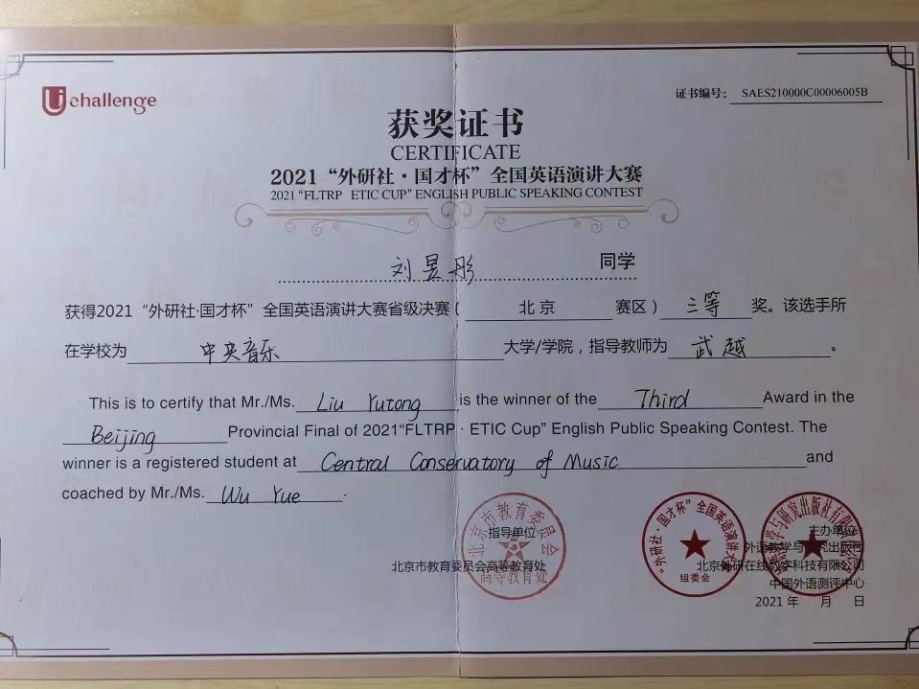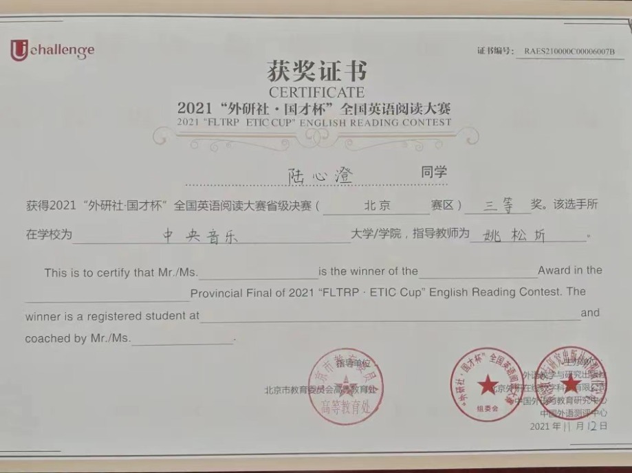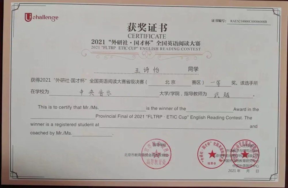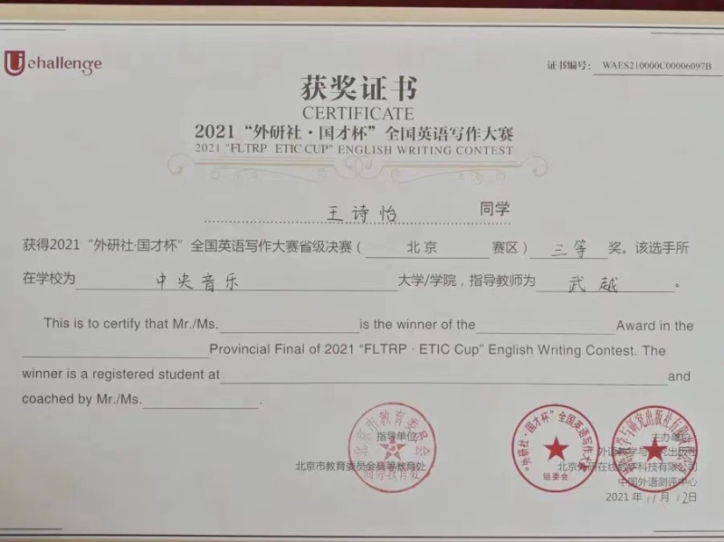 近日,2021年“外研社·国才杯”全国英语大赛北京赛区决赛落下帷幕。作为国内最具影响力的英语赛事之一,经过初赛,在京六十余所高校数百位优秀学子进入北京赛区的决赛。在名校荟萃的北京赛区,KY开元选拔的同学与北京大学、清华大学、中国人民大学等综合大学的顶尖选手竞相比拼,怀着“竹杖芒鞋轻胜马”的洒脱与“我辈岂是蓬蒿人”的自信,不畏强手,敢于争胜,取得了骄人的成绩。令人欣喜的是作曲系王诗怡同学(指导教师武越)荣获阅读大赛一等奖(共有10名选手获得一等奖),音乐学系冯柄桦同学(指导教师刘佳月)荣获写作大赛二等奖(共有20名选手获得二等奖),这是KY开元选手首次闯入该项赛事的一、二等奖阵列,摆脱了KY开元自参加该项赛事以来始终在三等奖方阵中徘徊的局面,获得了历史性突破。在落实艺术与人文并举的新发展理念,建设人文央音的征程中,两位同学的突破性成绩具有标志性意义。