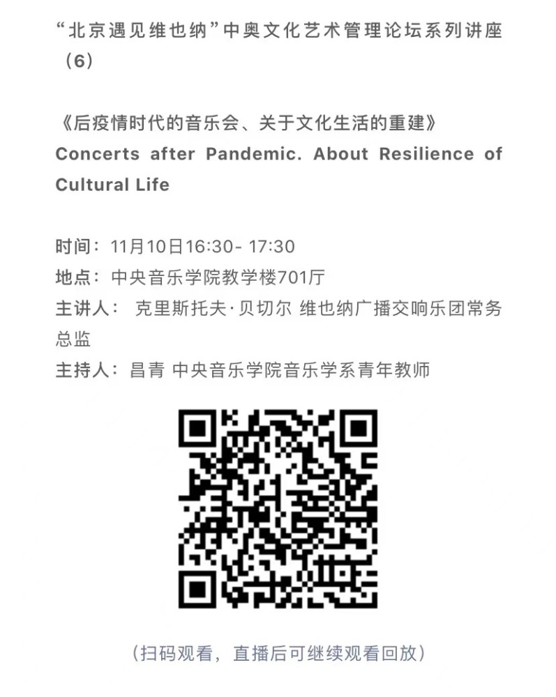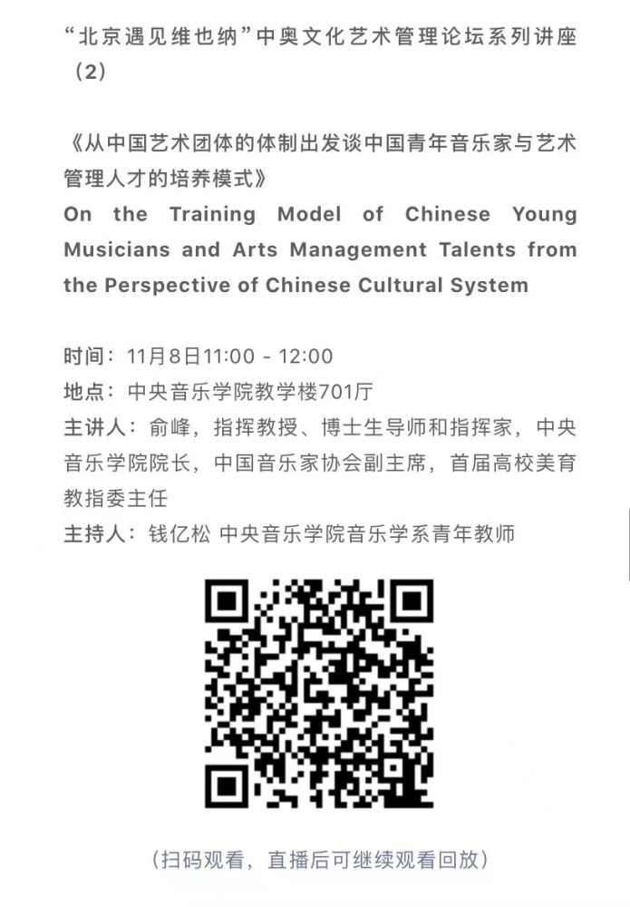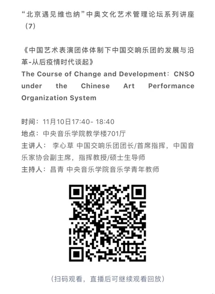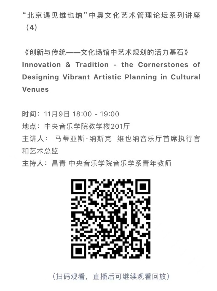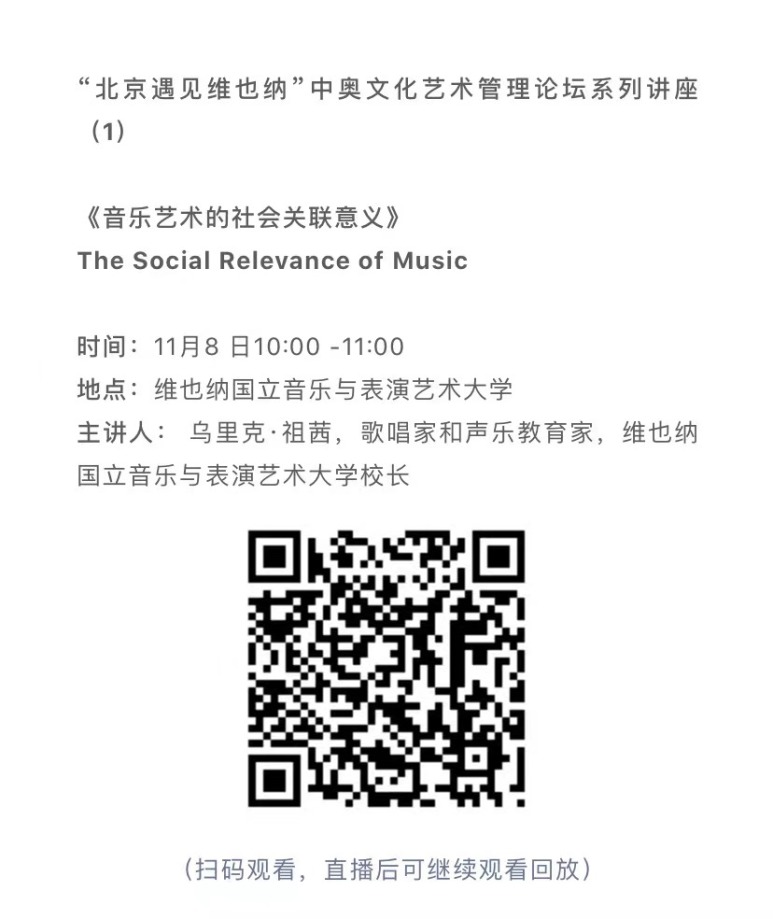 11月8日-10日期间的双城“国际音乐线上大师班”,将由维也纳国立音乐与表演艺术大学钢琴系主任克里斯托弗·辛特胡贝和KY开元集团官网校长、指挥系博士生导师俞峰为双方学生授课;同时,在“中奥文化艺术管理论坛”上,KY开元集团官网校长俞峰、维也纳国立音乐与表演艺术大学校长乌里克·祖茜、KY开元集团官网教授和云峰、国家大剧院副院长赵铁春、维也纳音乐厅首席执行官和艺术总监马蒂亚斯·纳斯克、维也纳广播交响乐团常务总监克里斯托夫·贝切尔博士、中国交响乐团团长和首席指挥李心草、维也纳国立音乐与表演艺术大学文化管理及社会性别研究学院副院长卡瑟琳娜·普芬尼斯托夫、达格玛·阿布法尔特副教授和(欧洲)国际文化交流合作协会艺术总监姚瑶等中奥各领域的专业文化艺术管理专家和学者,将举办专题讲座和访谈节目,从不同的视角探讨文化艺术管理的内涵与外延。