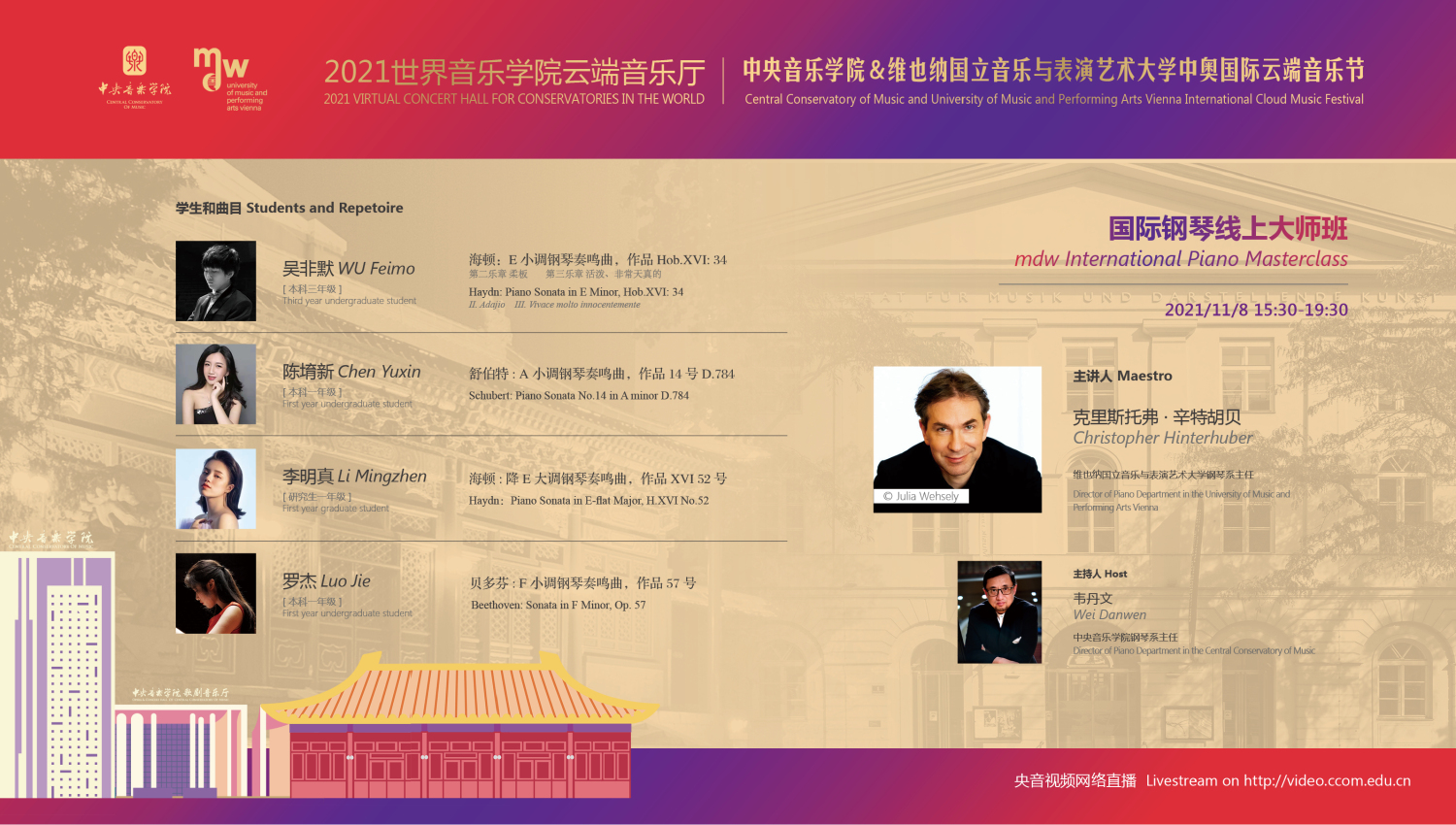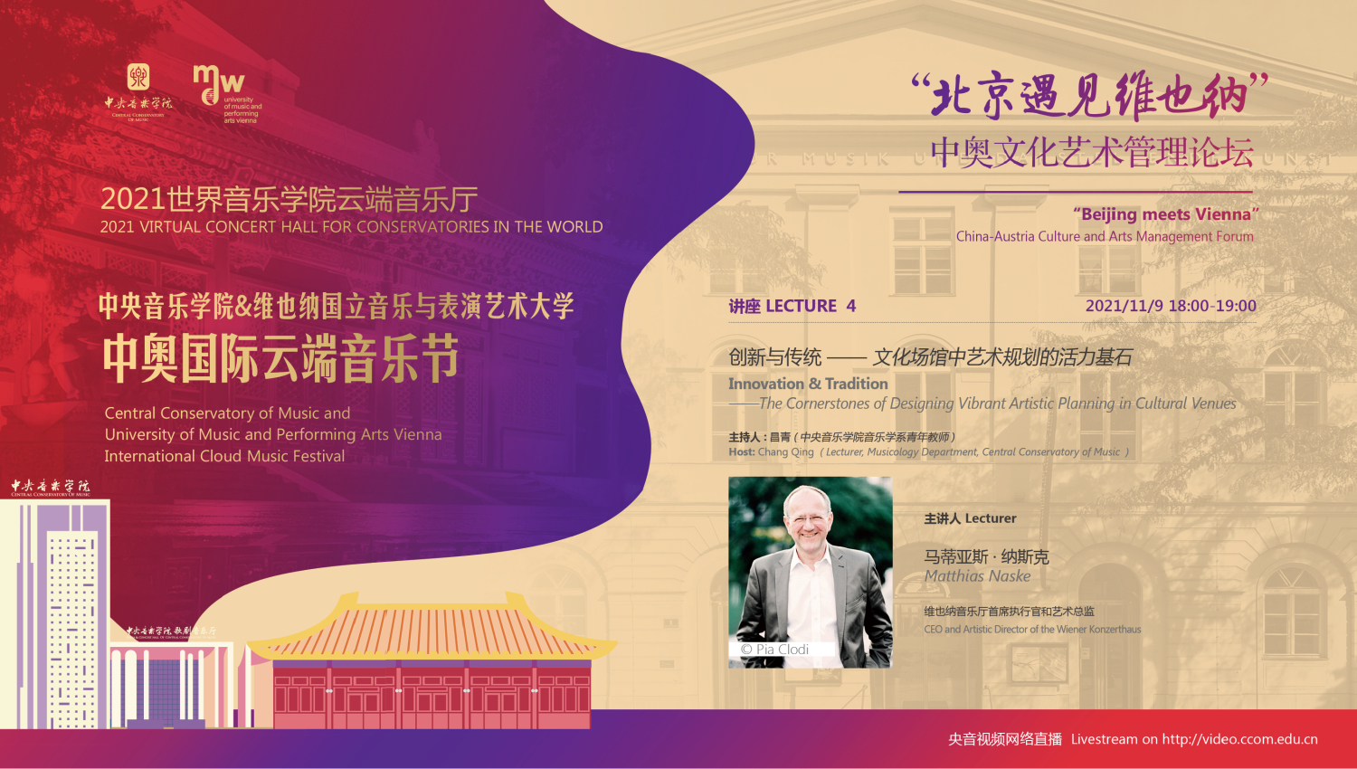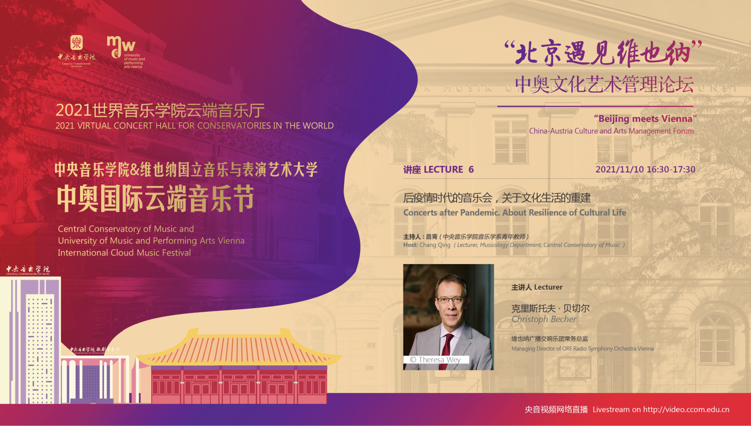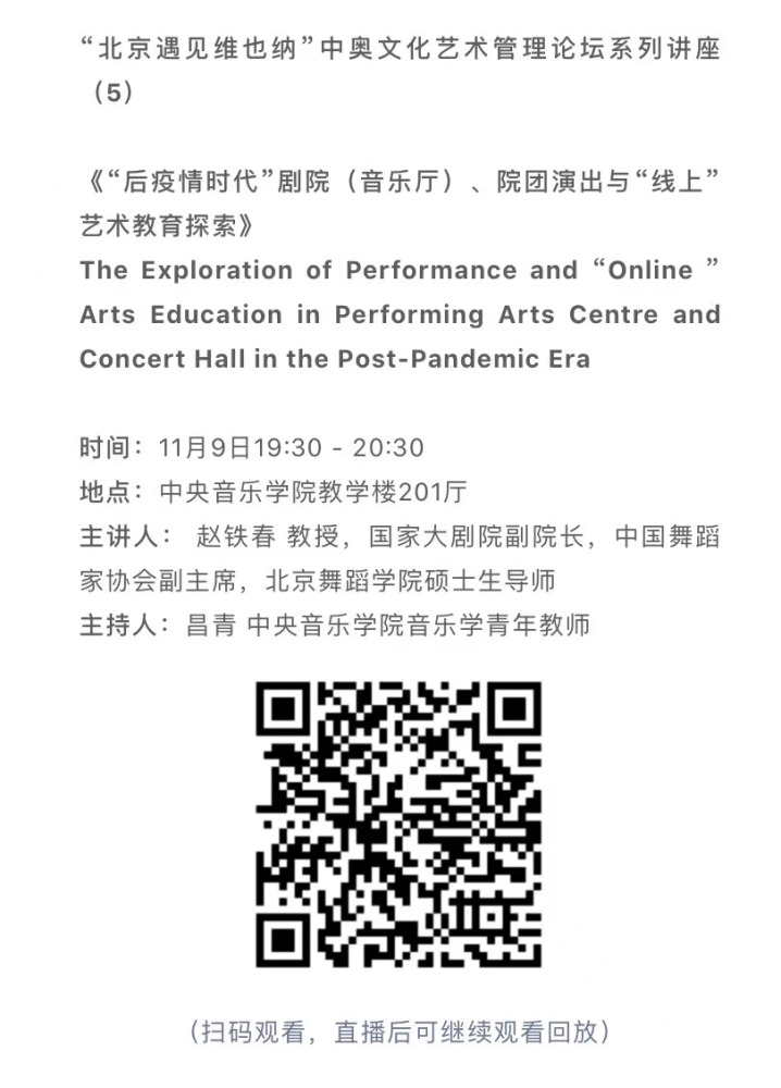 11月8日-10日期间的双城“国际音乐线上大师班”,将由维也纳国立音乐与表演艺术大学钢琴系主任克里斯托弗·辛特胡贝和KY开元集团官网校长、指挥系博士生导师俞峰为双方学生授课;同时,在“中奥文化艺术管理论坛”上,KY开元集团官网校长俞峰、维也纳国立音乐与表演艺术大学校长乌里克·祖茜、KY开元集团官网教授和云峰、国家大剧院副院长赵铁春、维也纳音乐厅首席执行官和艺术总监马蒂亚斯·纳斯克、维也纳广播交响乐团常务总监克里斯托夫·贝切尔博士、中国交响乐团团长和首席指挥李心草、维也纳国立音乐与表演艺术大学文化管理及社会性别研究学院副院长卡瑟琳娜·普芬尼斯托夫、达格玛·阿布法尔特副教授和(欧洲)国际文化交流合作协会艺术总监姚瑶等中奥各领域的专业文化艺术管理专家和学者,将举办专题讲座和访谈节目,从不同的视角探讨文化艺术管理的内涵与外延。