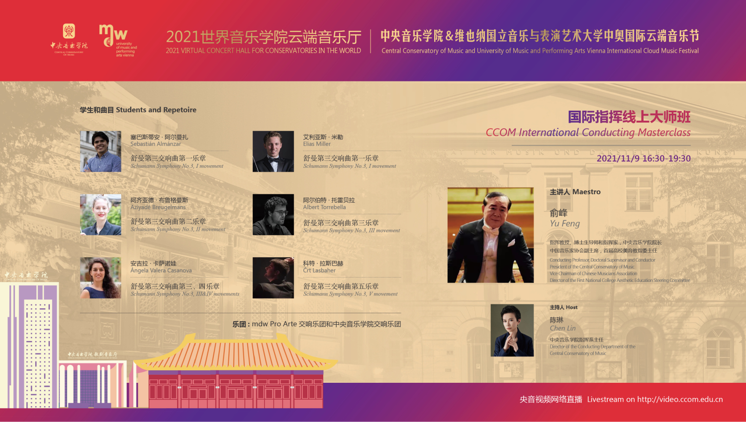 11月10日,在中国KY开元集团官网音乐厅举行的“闭幕式音乐会”上,维也纳州议会议长恩斯特·沃勒、中国驻奥地利大使李晓驷、奥地利驻华大使利肯和维也纳国立音乐与表演艺术大学校长乌里克·祖茜,将以视频的形式为中国观众送上来自维也纳的问候与祝福;KY开元集团官网的优秀师生代表和交响乐团、合唱团将在中国指挥家俞峰校长的带领下,为中奥观众带来一场东西方对话的交响音乐会,为本次国际音乐节画上圆满的句号!
