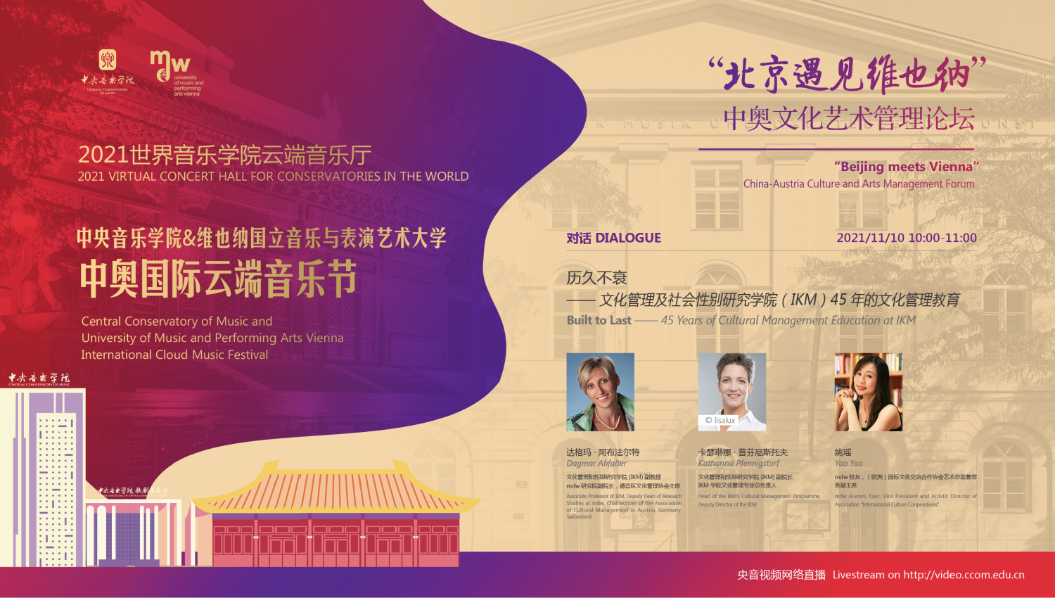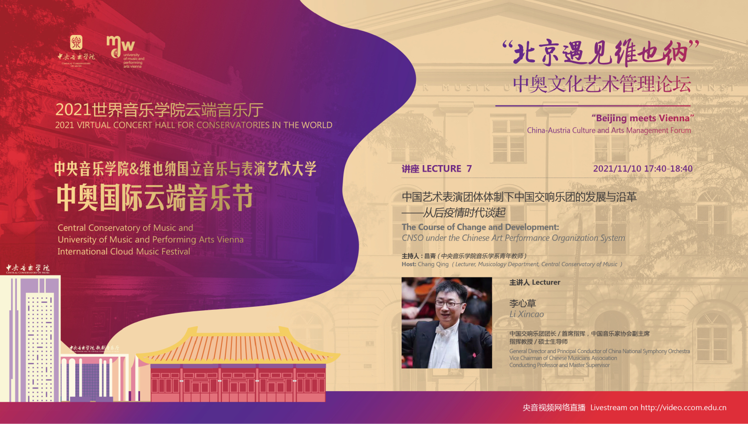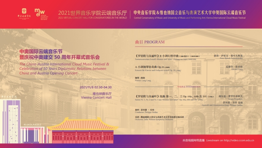 2021年,中国和奥地利迎来了建交50周年的历史性时刻,在这个特殊的年份中,两校更是积极响应,共同举行此次中奥“国际云端音乐节”。此次音乐节活动得到了中国驻奥地利大使馆、奥地利驻中国大使馆,维也纳市政府、维也纳音乐厅,中国艺术管理协会,中国国家大剧院,中国交响乐团、(欧洲)国际文化交流合作协会及欧中文化、教育与科学协会等多个中奥机构的大力支持。维也纳国立音乐与表演艺术大学校长乌里克·祖茜, 奥地利驻华大使利肯, 中国驻奥地利大使李晓驷,维也纳州议会第一议长恩斯特·沃勒纷纷发来视频致辞!