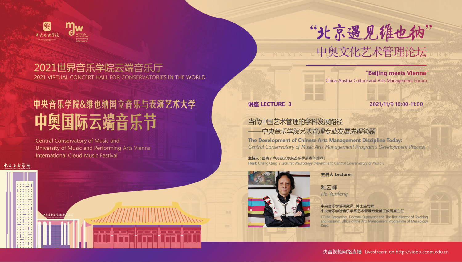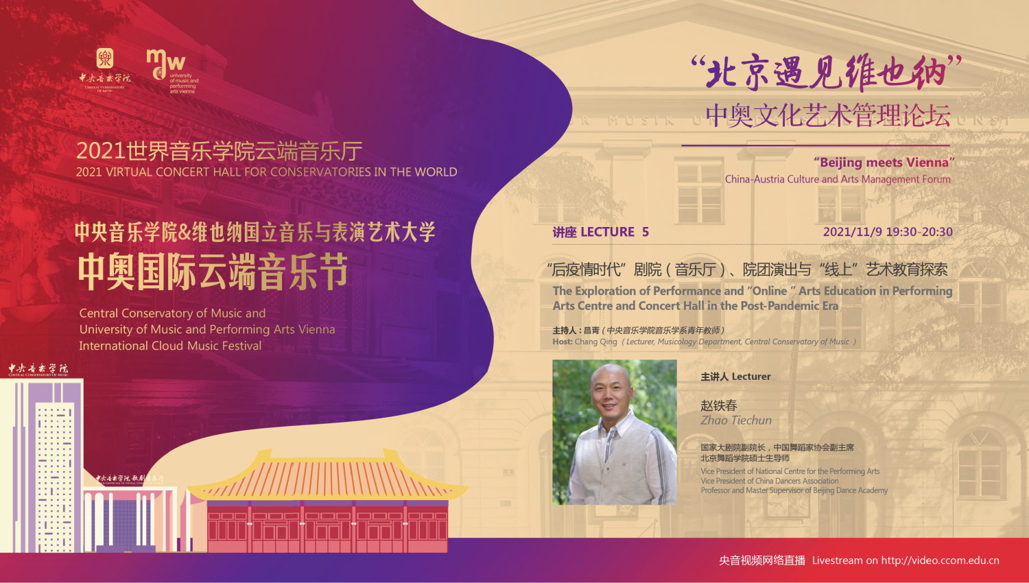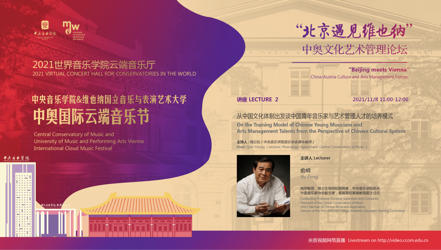 2021年,中国和奥地利迎来了建交50周年的历史性时刻,在这个特殊的年份中,两校更是积极响应,共同举行此次中奥“国际云端音乐节”。此次音乐节活动得到了中国驻奥地利大使馆、奥地利驻中国大使馆,维也纳市政府、维也纳音乐厅,中国艺术管理协会,中国国家大剧院,中国交响乐团、(欧洲)国际文化交流合作协会及欧中文化、教育与科学协会等多个中奥机构的大力支持。维也纳国立音乐与表演艺术大学校长乌里克·祖茜, 奥地利驻华大使利肯, 中国驻奥地利大使李晓驷,维也纳州议会第一议长恩斯特·沃勒纷纷发来视频致辞!