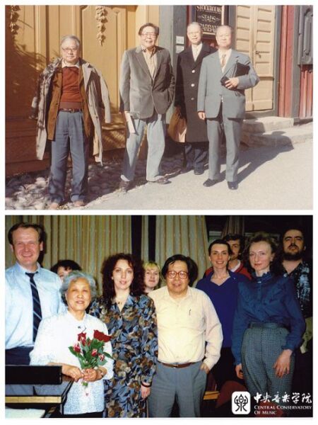 上,1983年9月,沈湘(左2)与赵沨(左1)、瞿维(左3)、苏扬(左4)到瑞典斯德哥尔摩参加国际音乐理事会年会。