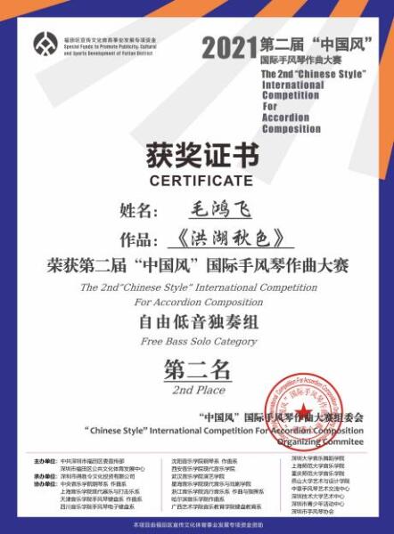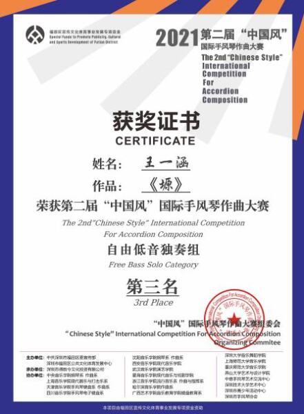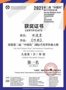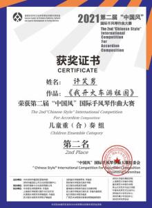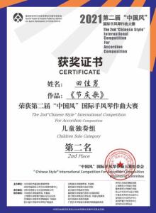 2021年10月3-24日,由中共深圳市福田区委宣传部、深圳市福田区公共文化体育发展中心主办的第二届“中国风”国际手风琴作曲大赛成功举办。大赛分为自由低音独奏组、传统低音独奏组、流行独奏组、流行重(合)奏组、重(合)奏及室内乐组、儿童独奏组、改编作品组、儿童重(合)奏组8项组别,各组分设一、二、三名。来自中国、俄罗斯、法国、芬兰、西班牙、乌克兰的各大院校作曲家、教授等24名专家担任本次大赛的评审工作。经评审组初审,共计67部作品进入总决赛。KY开元师生在本次大赛中共荣获四项第一名、三项第二名、一项第三名的佳绩,在此向以下获奖师生及导师表示祝贺!