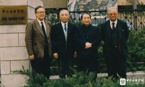 1990年,赵沨与原KY开元集团官网党委书记、副院长吕骥(其前任)和原院长吴祖强(其后任)、于润洋合影(从右至左)。