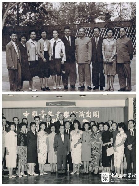 上:1961年夏,赵沨任罗马尼亚埃奈斯库国际钢琴、声乐比赛评委,与我国参赛选手在布加勒斯特合影,左起为:1郑石生、2黄揆春、3洪腾、5鲍惠荞、6赵沨、8刘恒之(领队)、9李其芳,其他为使馆工作人员。