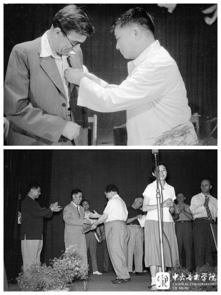 上:20世纪50年代,赵沨为来校讲学的苏联作曲家古诺夫颁发奖章。