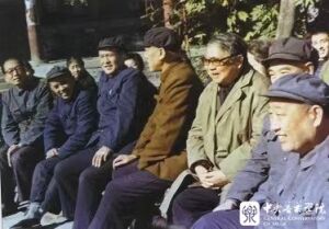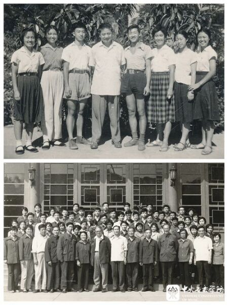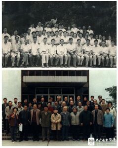 下:1982年,赵沨(左7)等学校领导与1978级部分毕业生合影。