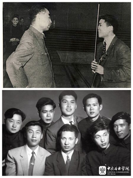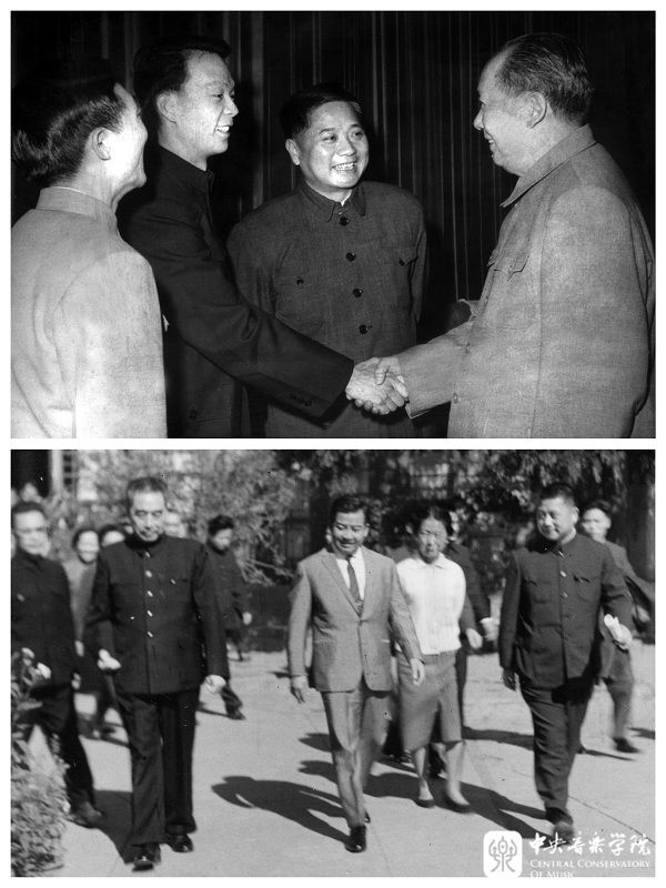 上:1963年除夕夜,KY开元集团官网师生赴中南海为中央首长演出,毛泽东主席亲切接见赵沨(左3)等人(左1刘德海,左2黎信昌)。