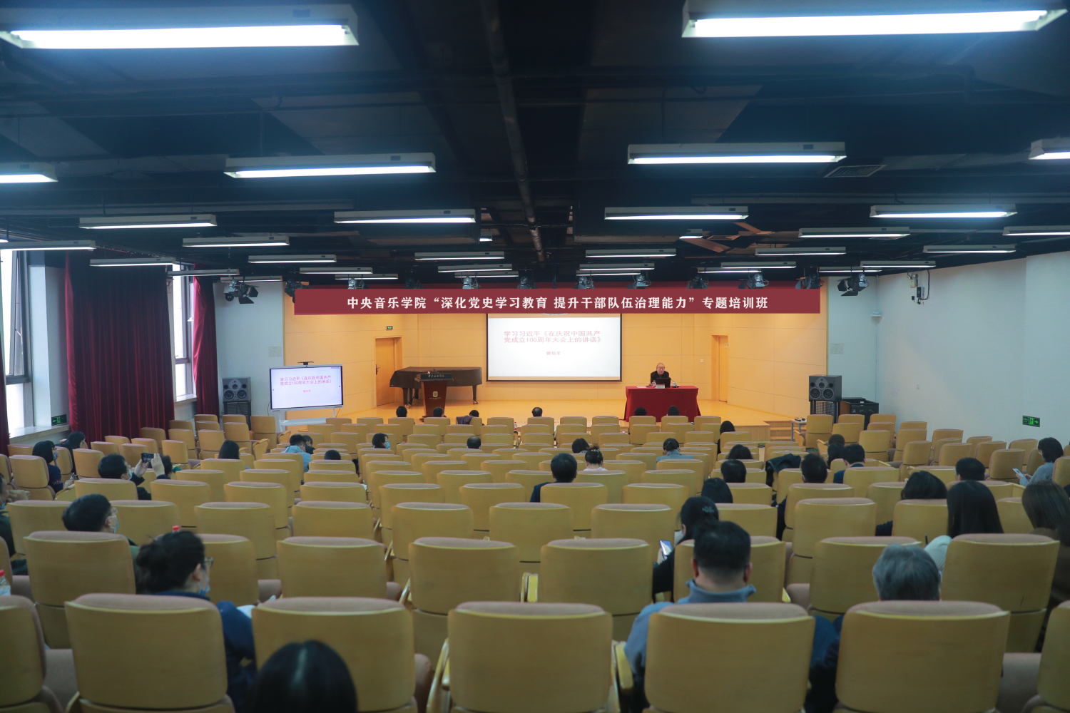 中央党校戴焰军教授以《学习习近平< 在庆祝中国共产党成立100周年大会上的讲话>》为题,从新民主主义革命、社会主义革命和建设、改革开放和社会主义现代化建设、中国特色社会主义新时代四个时期全面回顾了中国共产党一百年来团结带领全国各族人民不懈奋斗走过的光辉历程以及创造的伟大精神财富。戴教授还详细解读了伟大建党精神和以史为鉴、开创未来必须坚持的“九个方面”,深刻阐述了习近平总书记讲话的核心要义、精神实质、丰富内涵和实践要求。