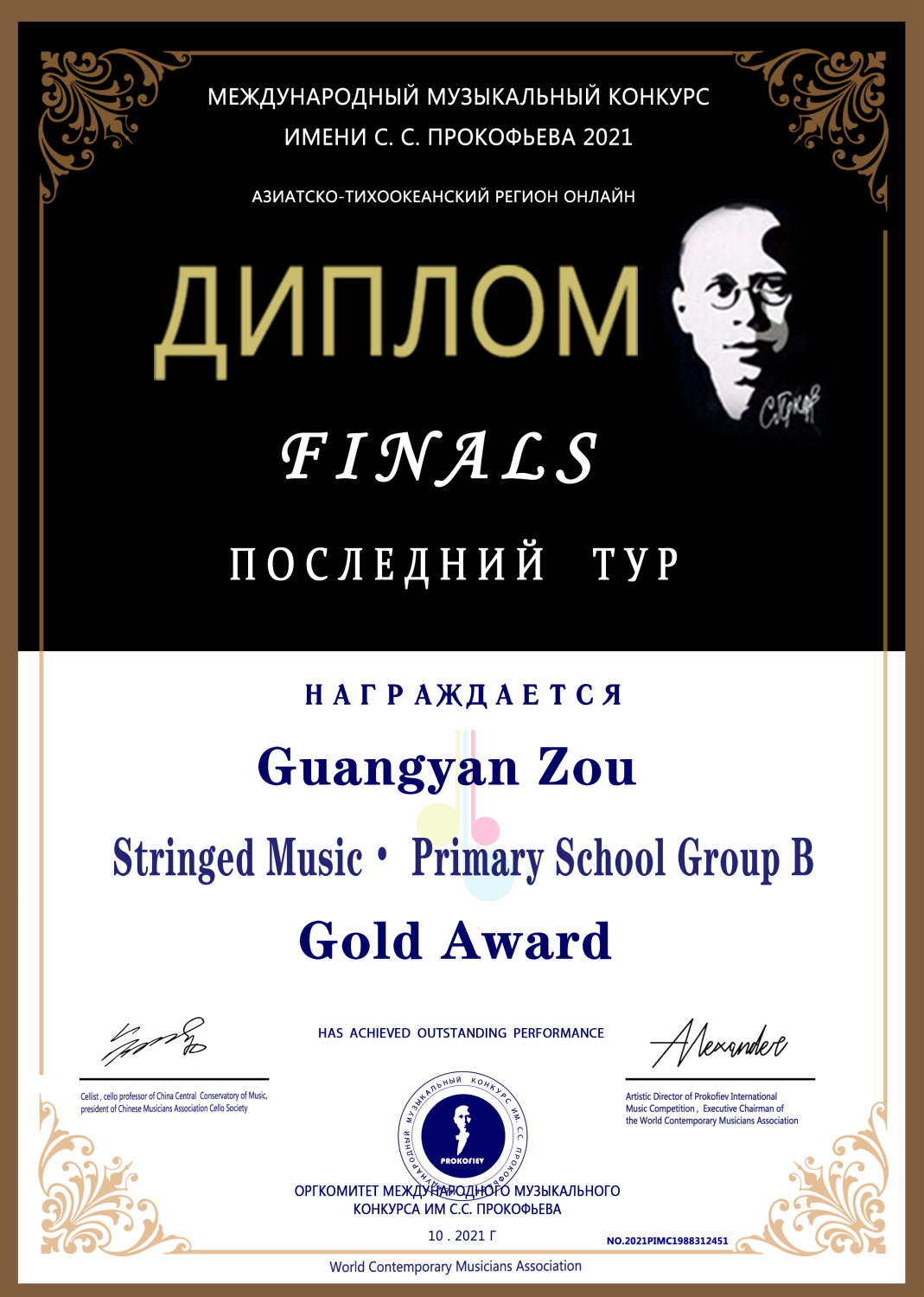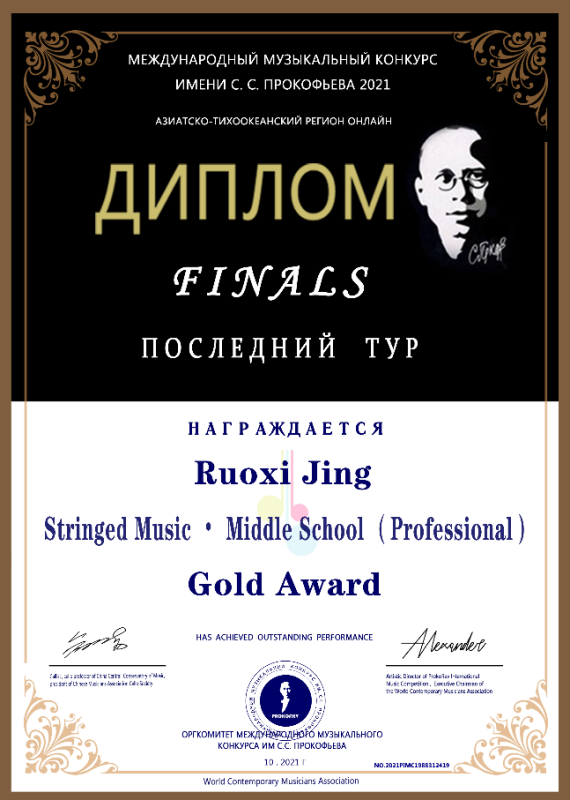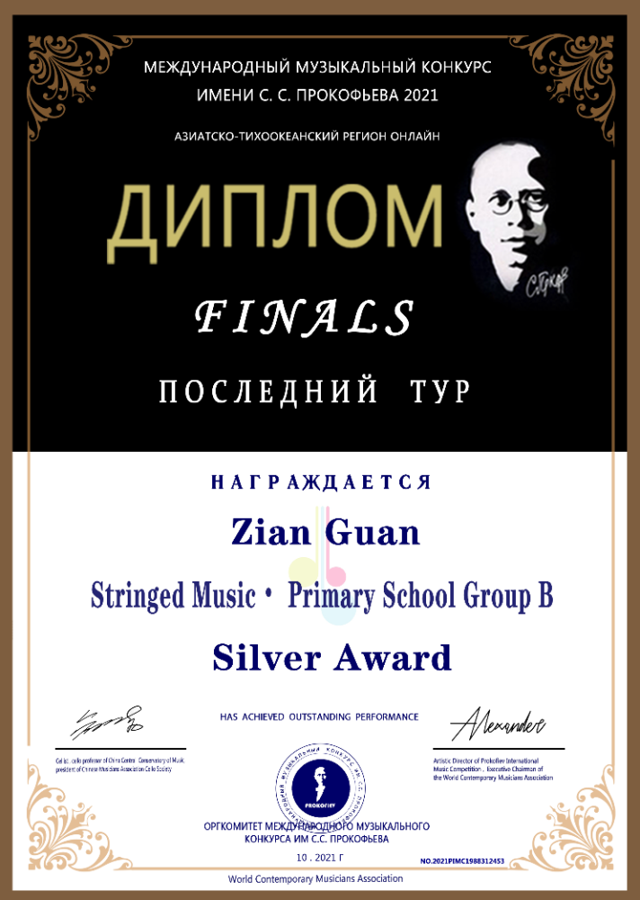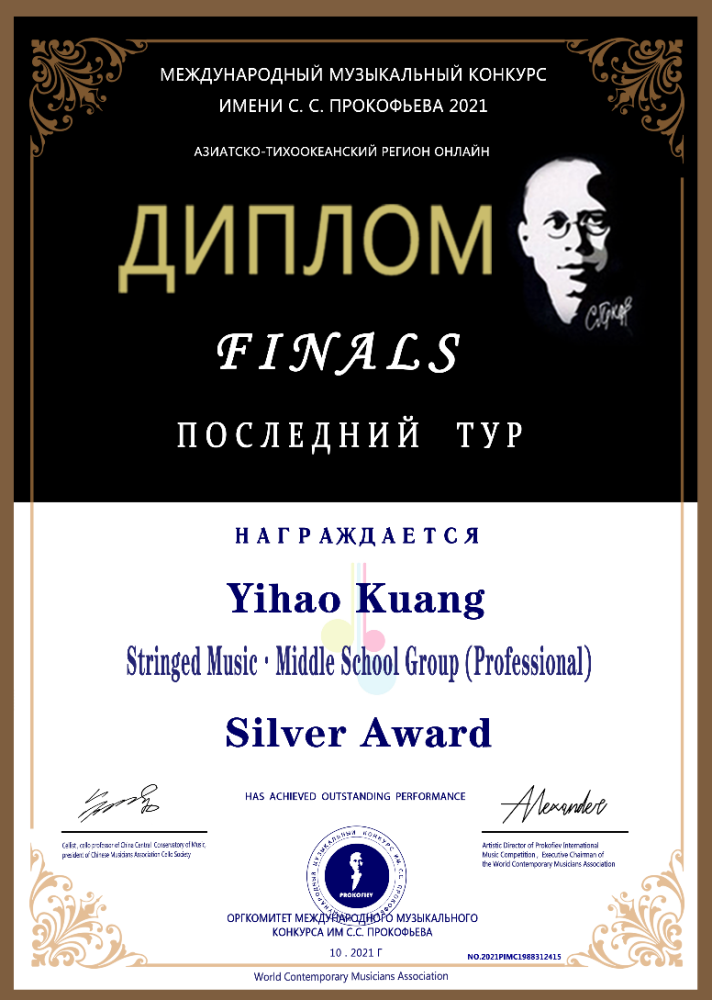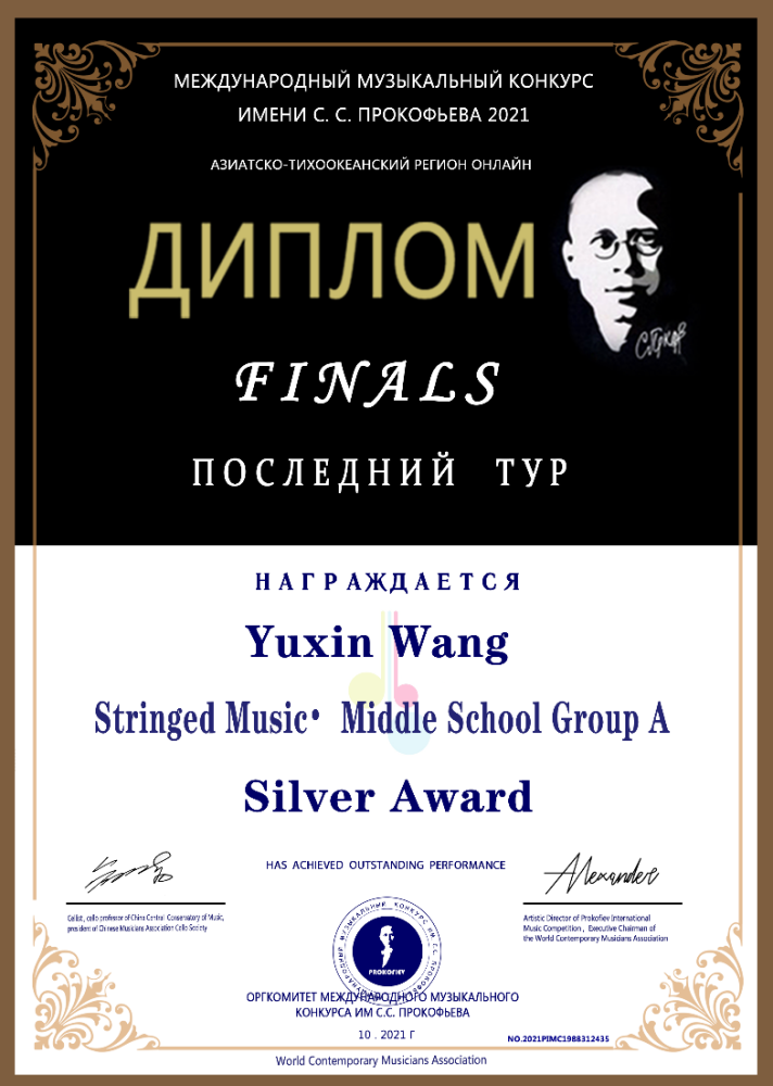 2021年荣获普罗科菲耶夫国际音乐大赛亚太区线上弦乐中学A组银奖(金奖空缺)。