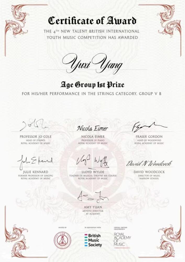 2021年英国伦敦“艺术家大奖赛”国际音乐比赛9-12岁组一等奖,并受邀去伦敦皇家阿尔伯特大厅参加获奖音乐会。