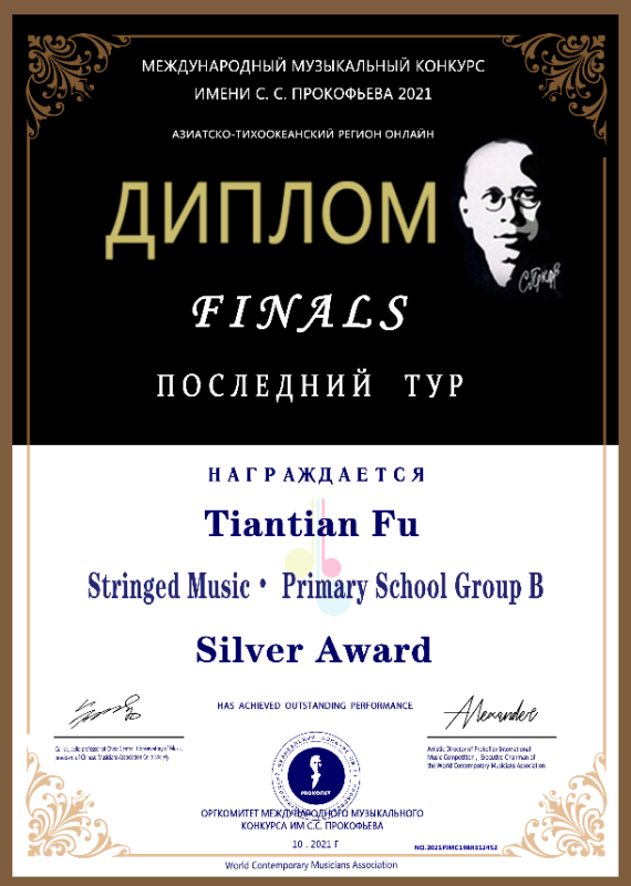 2021荣获年普罗科菲耶夫国际音乐大赛亚太区线上弦乐小学B组银奖。