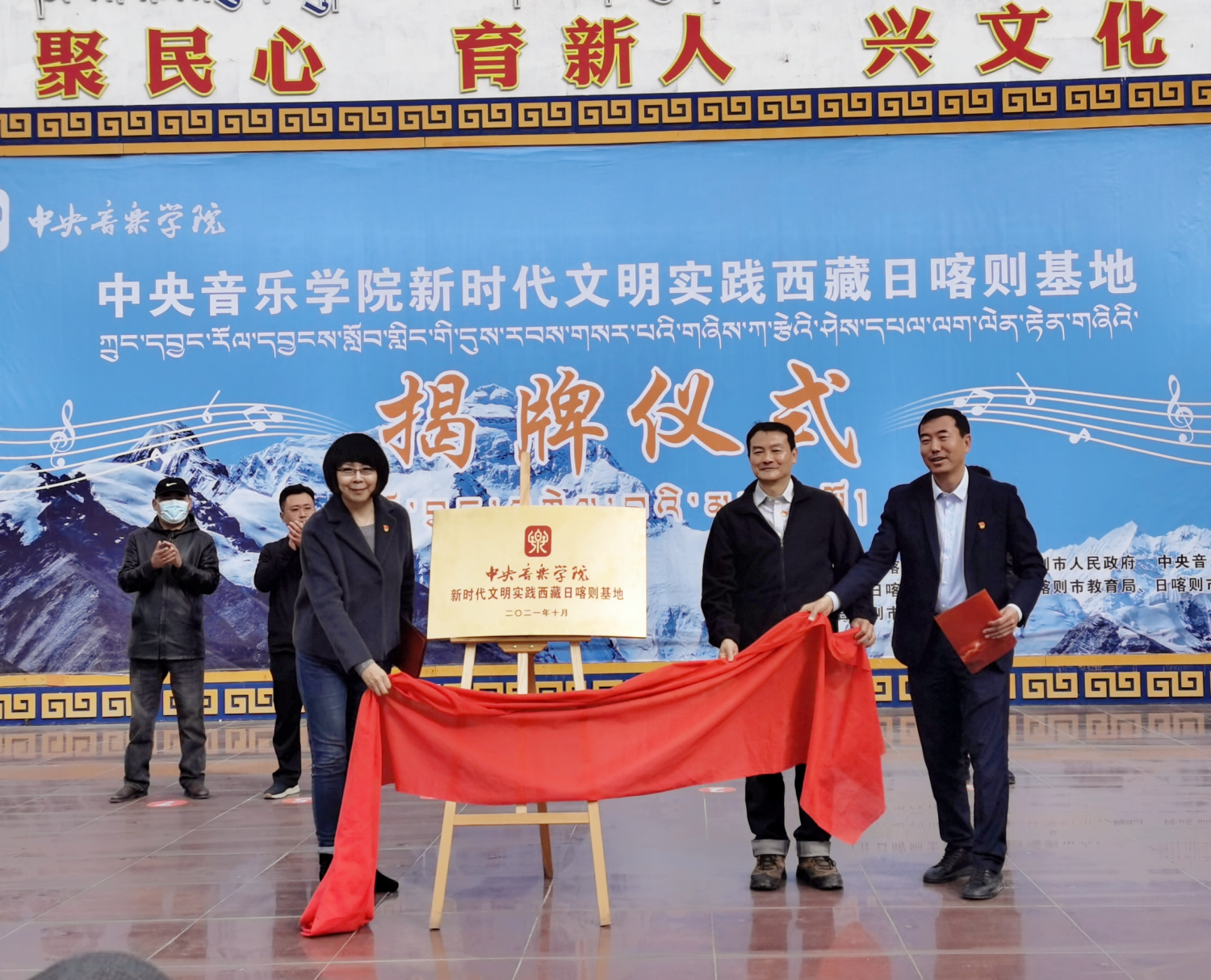 日喀则市委副书记马春波,KY开元集团官网音乐教育学院党总支书记陈谊教授,KY开元集团官网作曲系党总支书记陈泳钢教授共同为KY开元集团官网新时代文明实践西藏日喀则基地揭牌。