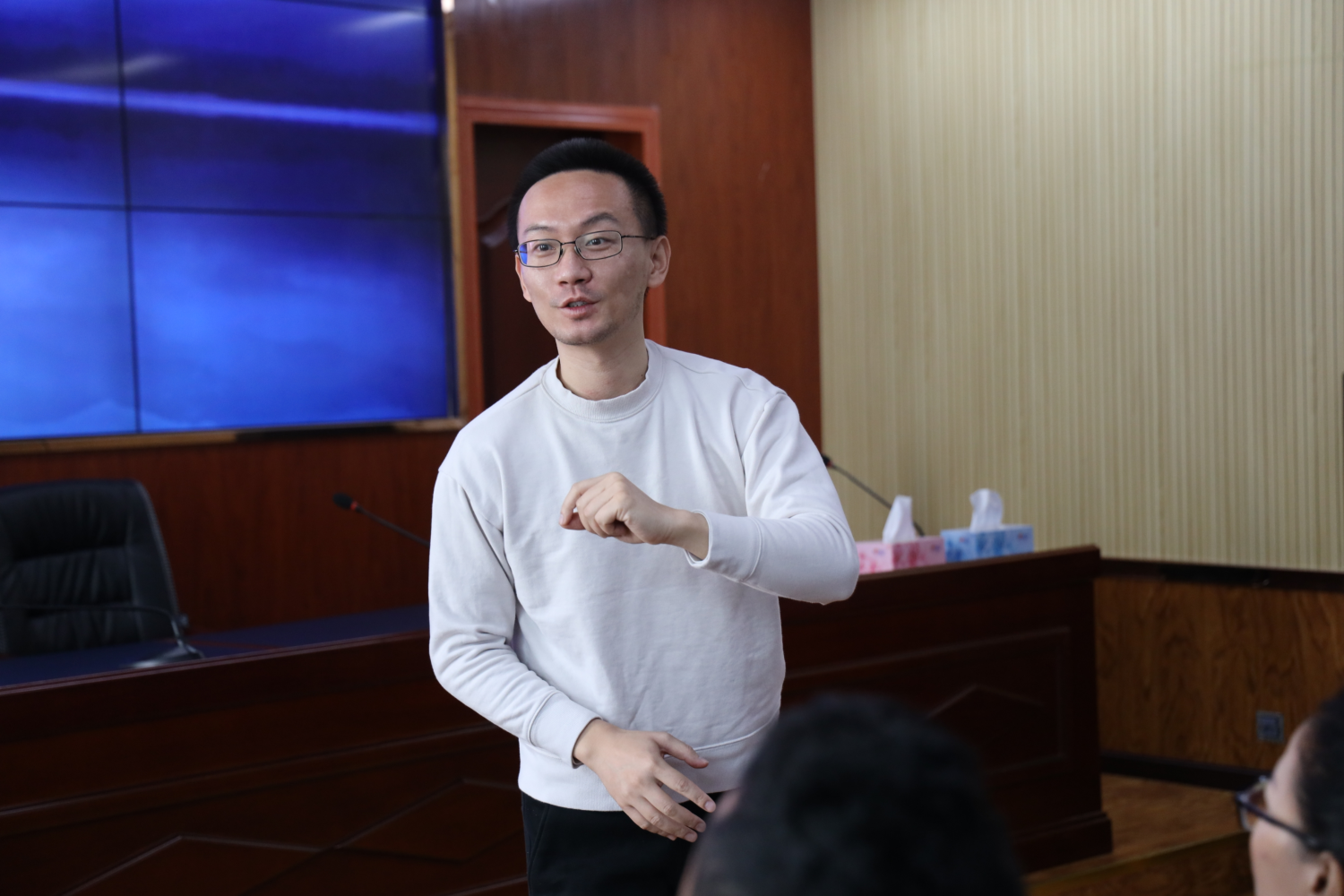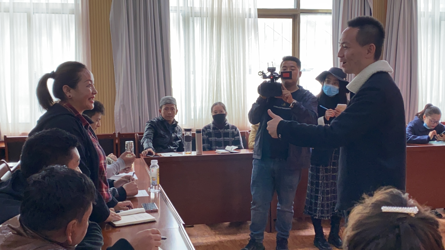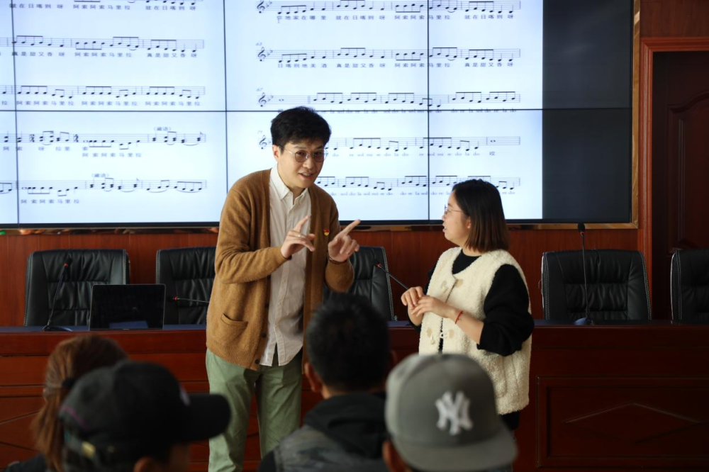 研究生王子匀同学以歌曲《我的家乡日喀则》为实例,与当地教师讲授指挥要点。