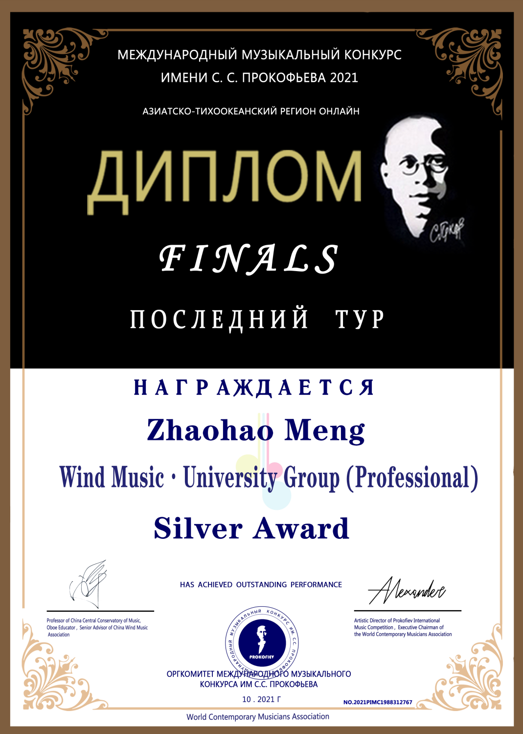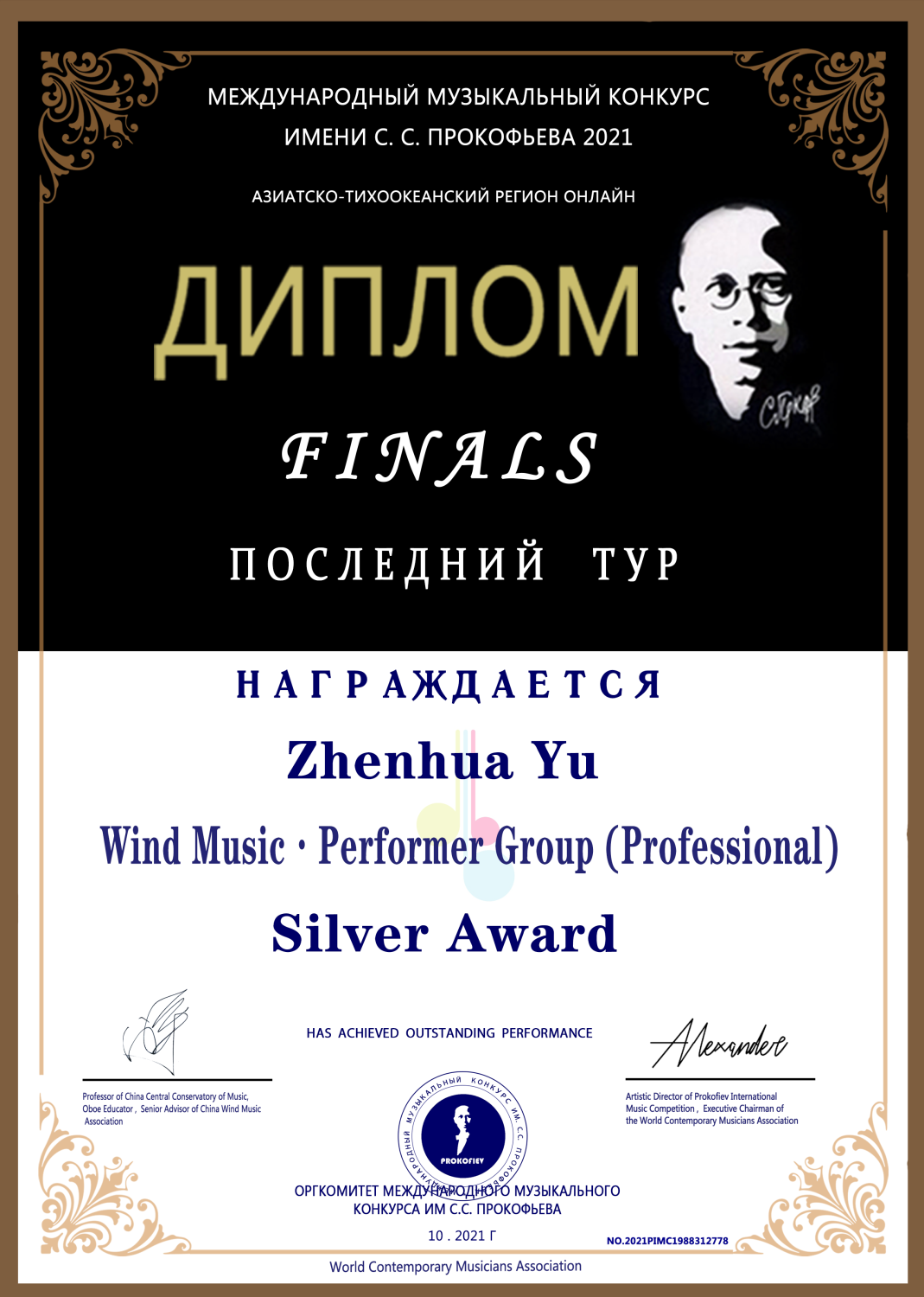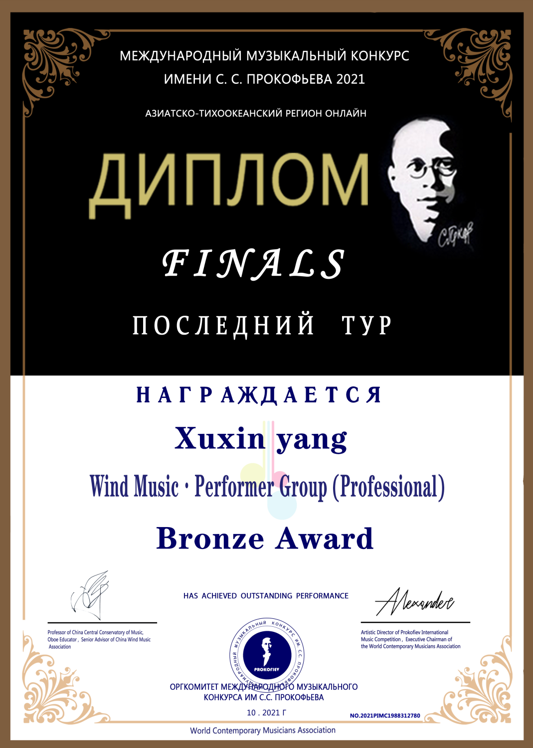 2021年获得普罗科菲耶夫大赛低音提琴演奏家组决赛银奖(金奖空缺)。