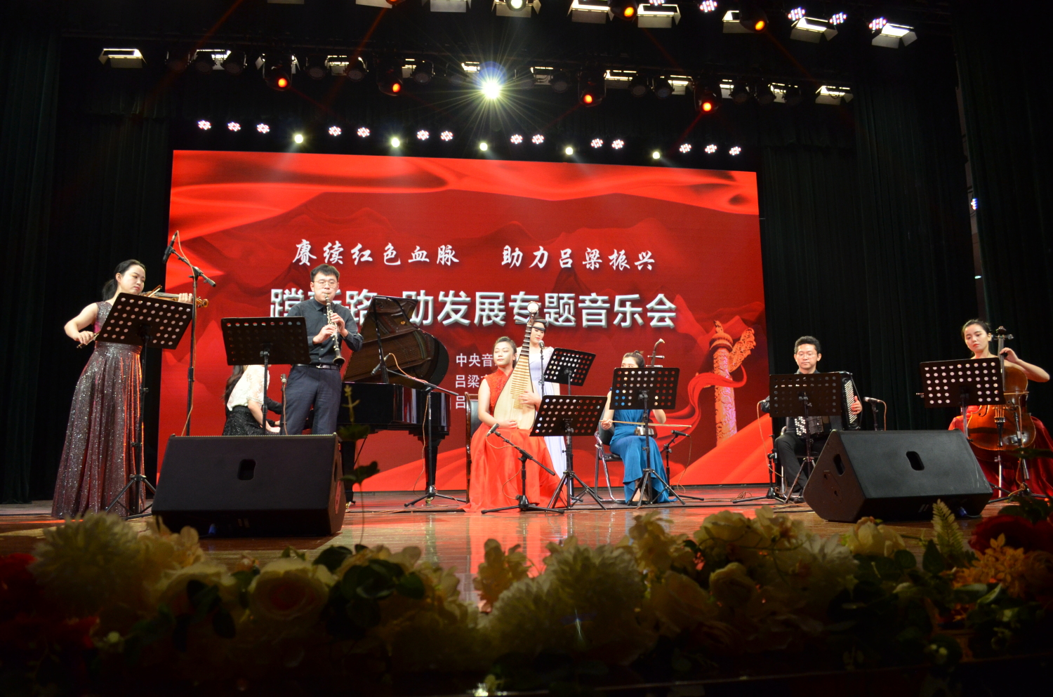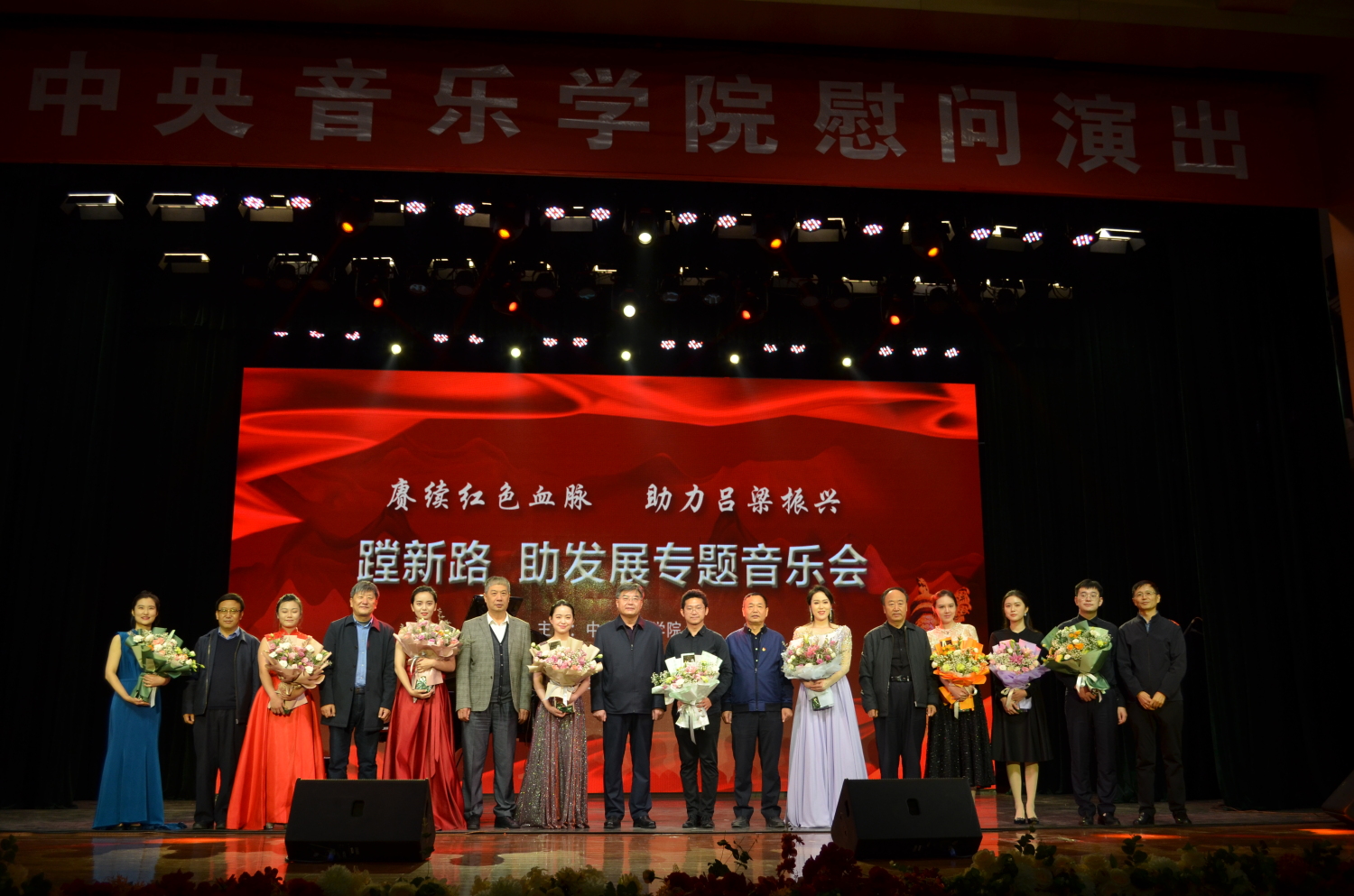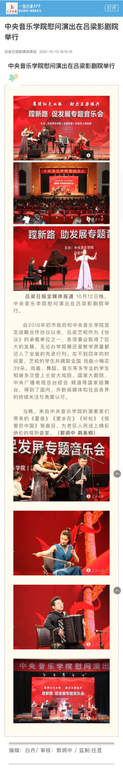 10月12日晚,“赓续红色血脉、助力吕梁振兴;蹚新路、促发展专题音乐会——KY开元集团官网慰问演出”在吕梁影剧院举行。KY开元集团官网9位青年教师生以精湛的表演,为吕梁老区人们奉献了13部(首)中外音乐作品。