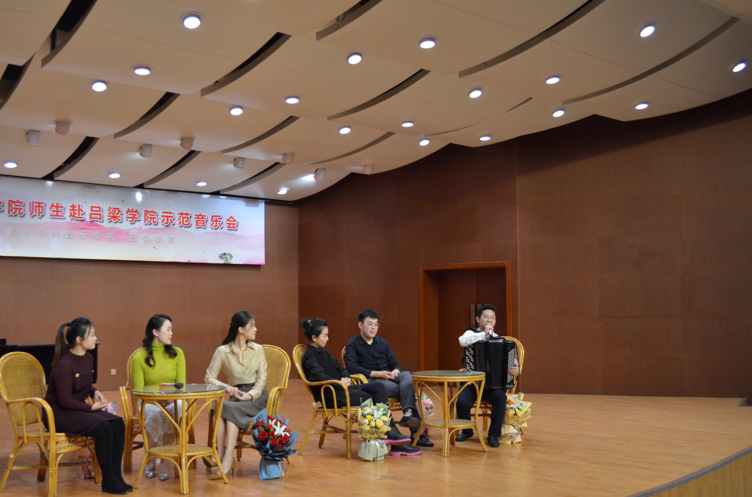 另一场音乐会于10月13日下午在吕梁学院音乐厅举行。这是一场别开生面的“示范音乐会”。与以往不同,演奏家先对作品的创作背景和音乐内涵作了详细介绍和解读之后,再演奏示范。6位青年教师的精彩演奏和讲解,让这场具有教学示范意义的音乐会,充满了热烈和融洽的氛围。