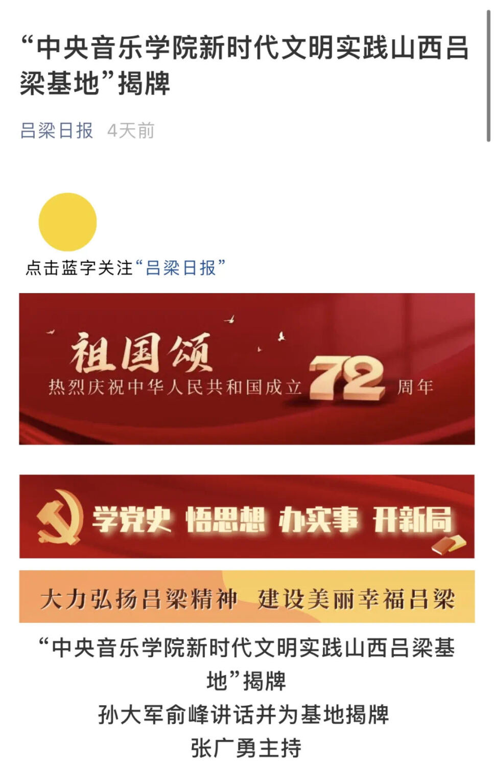 在举国欢庆新中国72华诞之际,“KY开元集团官网新时代文明实践山西吕梁基地”的成立是贯彻新思想、讴歌新时代的有力举措,是扩展校际合作新领域的重要实践;也打造了学习宣传新思想的新平台、展示新时代理论的新阵地,KY开元将以此为契机,开拓思路,创新方法,为推动习近平新时代中国特色社会主义思想走深、走实、走进寻常百姓家,奉献音乐高校的一份力量。
