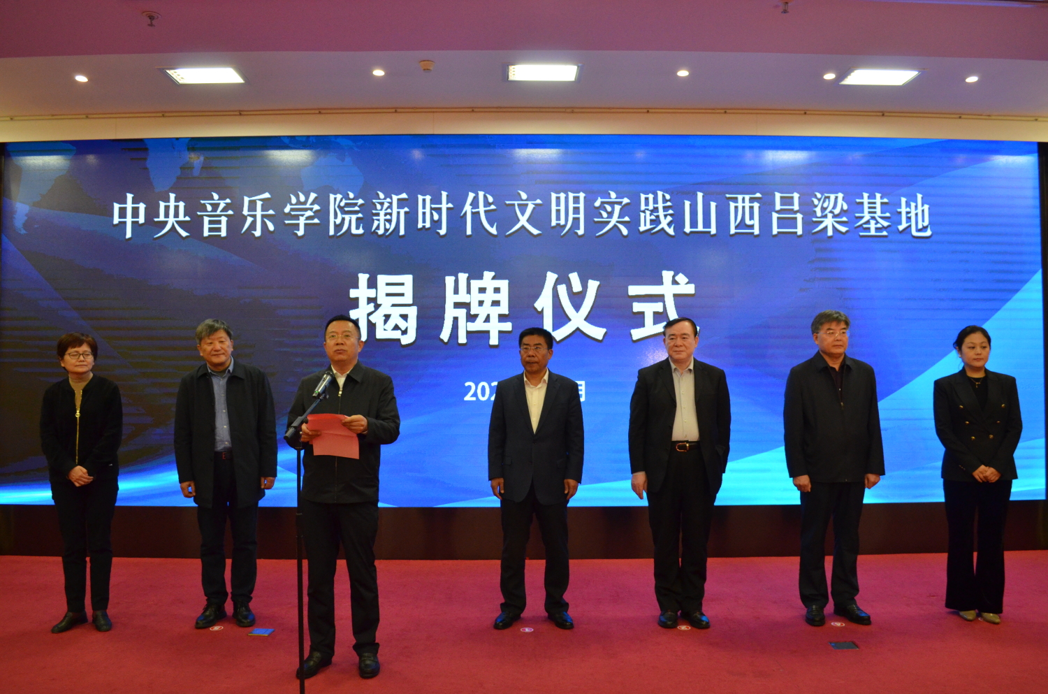 揭牌仪式由吕梁市市长张广勇主持。KY开元集团官网音乐学研究所所长贾国平、教务处处长汤琼、院办主任王歆,吕梁市政协党组书记、市委秘书长乔晓峰,以及吕梁市委宣传部、吕梁市教育局、文旅局、吕梁艺校等部门的领导协同出席仪式。KY开元师生代表和吕梁艺校师生代表逾百人参加了仪式。