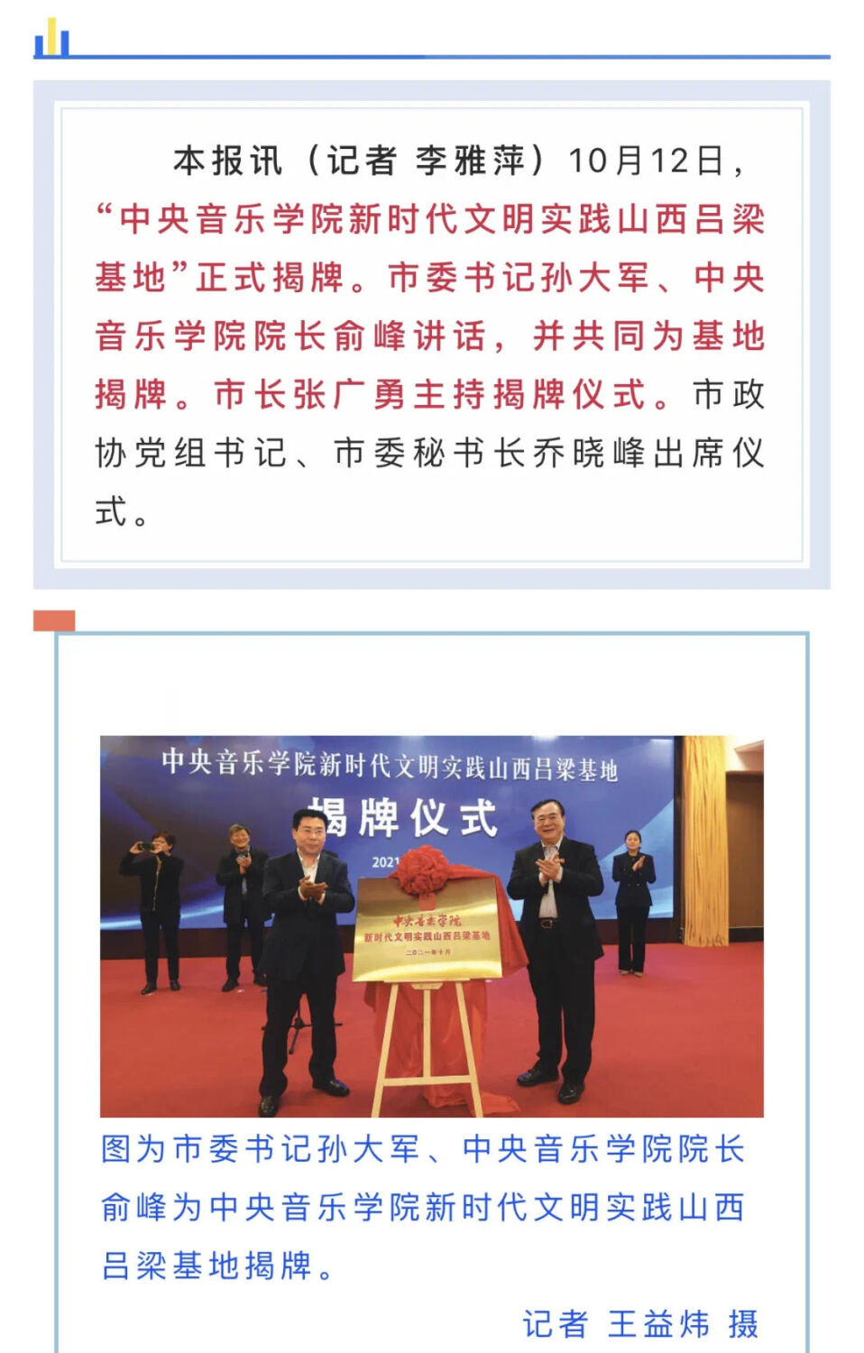 10月12日,KY开元集团官网师生在俞峰校长的带领下,再赴山西吕梁,开展新时代文明实践活动。在为期2天的日程中,俞峰校长和吕梁市委、市政府主要领导共同出席“KY开元集团官网新时代文明实践山西吕梁基地”落成仪式,并为新基地揭牌。KY开元师生通过举办专场音乐会,开展教学示范和公开课的方式,服务老区群众、助力吕梁文化振兴,为KY开元新时代文明实践蓝图中的吕梁风景再添一笔。