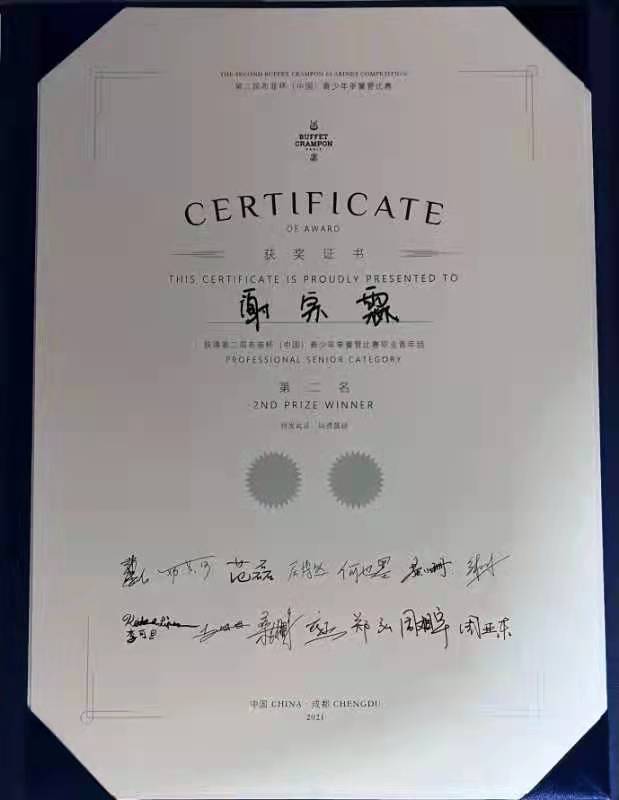 获奖及演出经历:2016年3月参加第三届KY开元集团官网国际莫扎特单簧管比赛,荣获三等奖;2017年7月参加上海青少年单簧管演奏比赛,荣获职业少年组第三名;2018年5月荣获KY开元集团官网附中第五届奖学金比赛三等奖;2018年7月受邀赴比利时参加国际单簧管协会(ICA)2018年会音乐节演出并获好评;2018年8月参加2018Buffet亚太单簧管音乐大赛,荣获第一名;2018年11月参加第十一届穆拉文斯基国际青少年管乐比赛,荣获第三名;2019年4月作为KY开元集团官网附中优秀学生前往澳门交流演出;2019年7月参加第一届布菲杯(中国)青少年单簧管比赛,荣获职业少年组第三名;2019年9月参加KY开元集团官网少年交响乐团成立60周年音乐会演出;2020年11月参加第16届意大利Saverio Mercadante 国际单簧管比赛,荣获青年Junior Soloists组第一名;2021年9月参加第二届布菲杯(中国)青少年单簧管比赛,荣获职业青年组第一名。