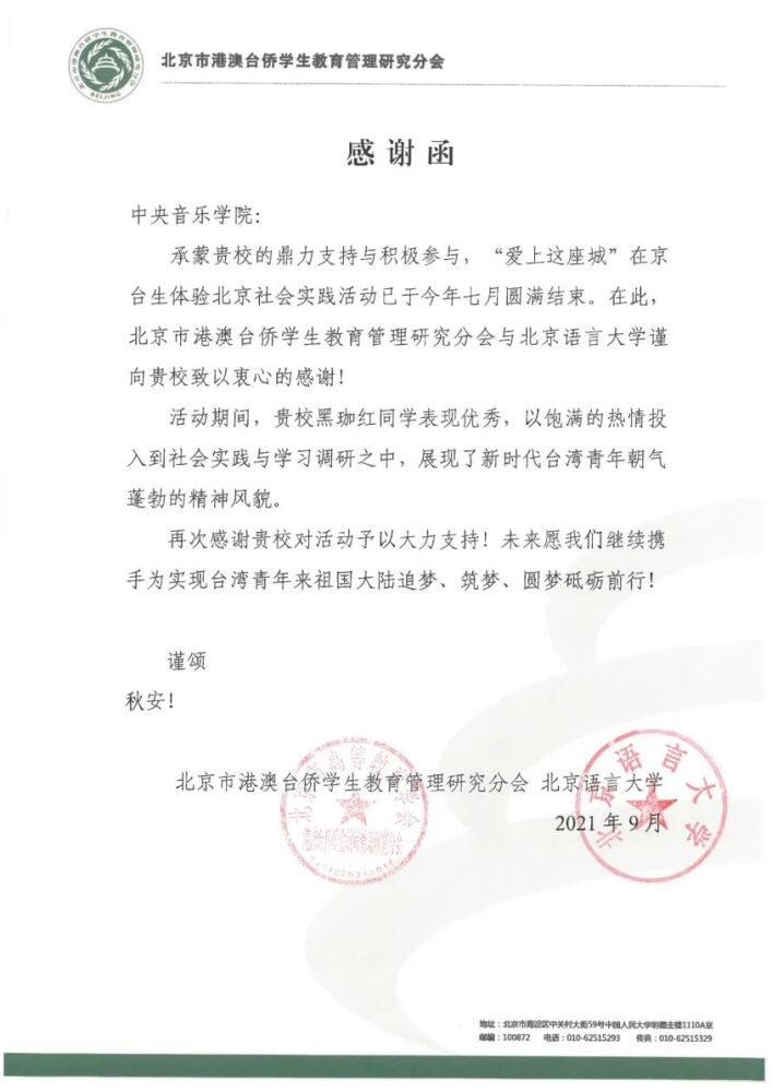近期,KY开元收到了来自北京市港澳台侨学生教育管理研究分会主办,北京语言大学的感谢函,感谢KY开元对“爱上这座城”在京台生体验北京社会实践活动的鼎立支持和积极参与,以及台生黑珈红同学的优秀表现,展现了当代台湾朝气蓬勃的精神风貌。