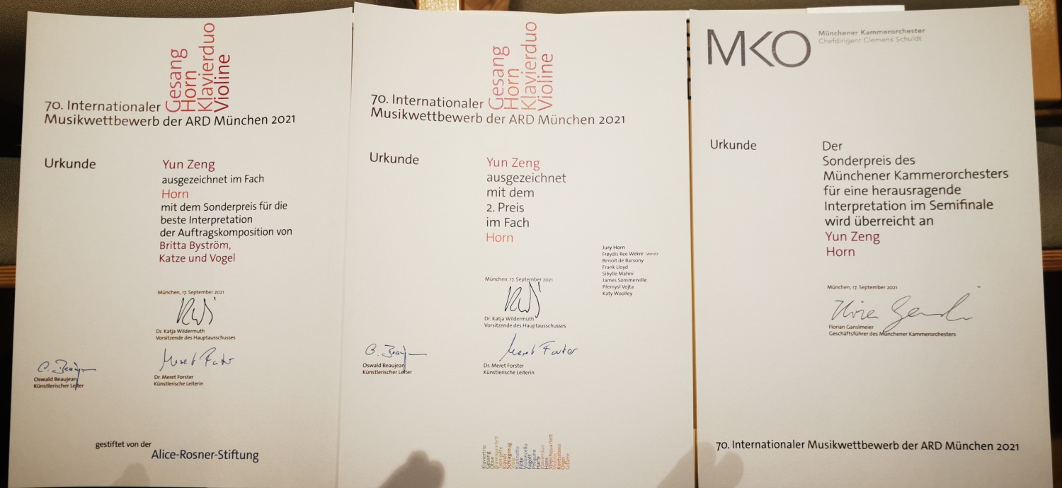 在刚刚结束的第70届慕尼黑ARD国际音乐比赛圆号决赛中,KY开元曾韵同学荣获正赛第二名、最佳委约作品奖、唯一室内乐特别大奖三项大奖。(指导教师:温泉教授)
