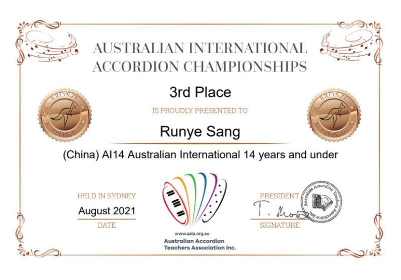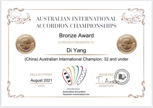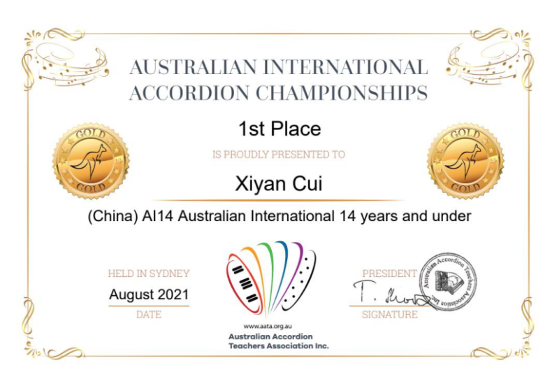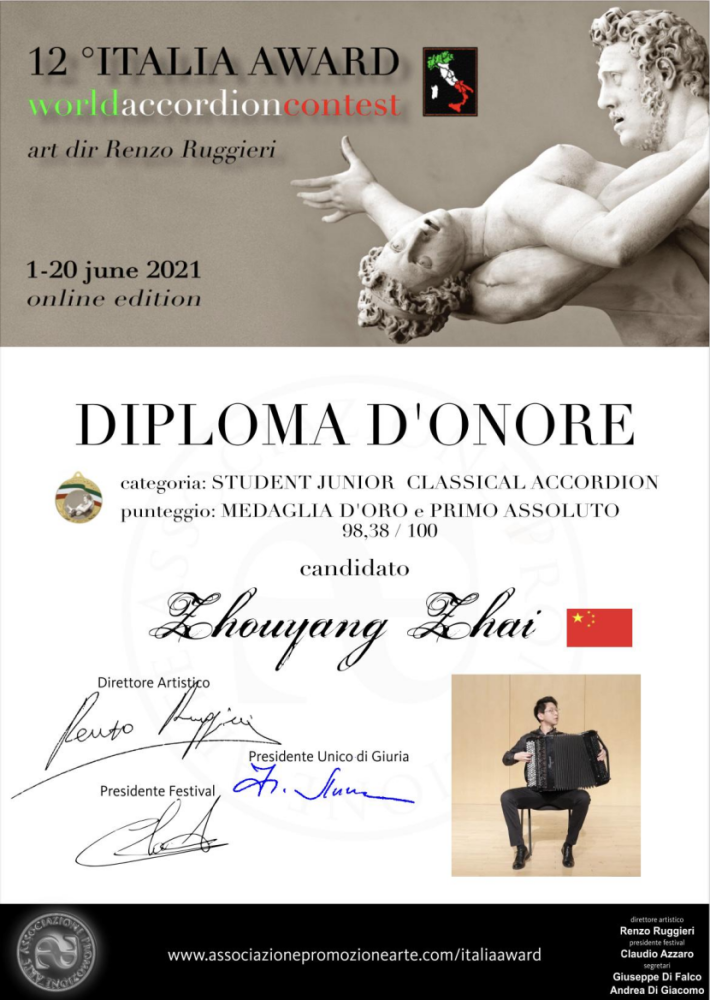 另外,在上学期期末六月份举办的第十二届“意大利奖”世界手风琴比赛(12th Italia Award World Accordion Contest)中,附中同学获得多项第一名。