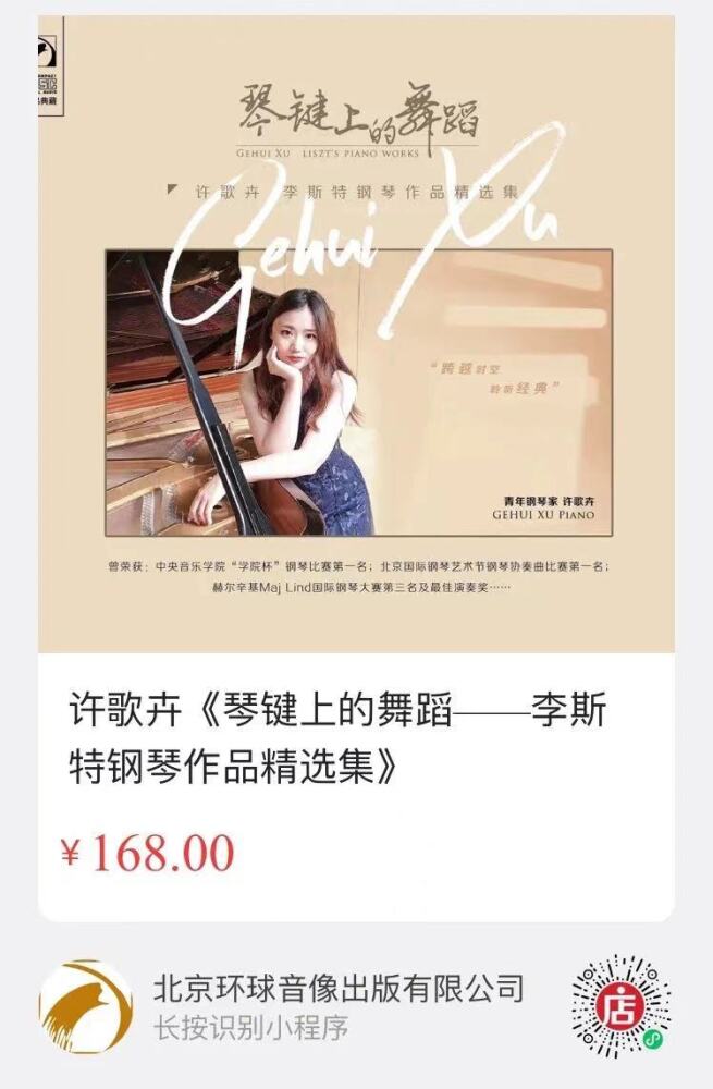 最近,许歌卉女士推出了她的全新个人CD专辑《琴键上的舞蹈——李斯特钢琴作品精选集》,由北京环球音像出版有限公司出版,并独家进行全球数字发行。