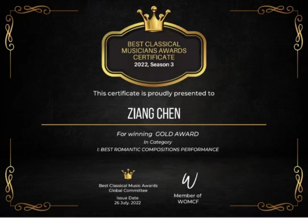 管弦系研究生二年级中提琴专业学生陈子昂获得2022年夏季英国最佳古典音乐家大奖赛Best Classical Musicians Awards (BCMA)浪漫派作品最佳演奏金奖、最佳演奏家特别奖两大奖项(指导教师王昌海教授)。