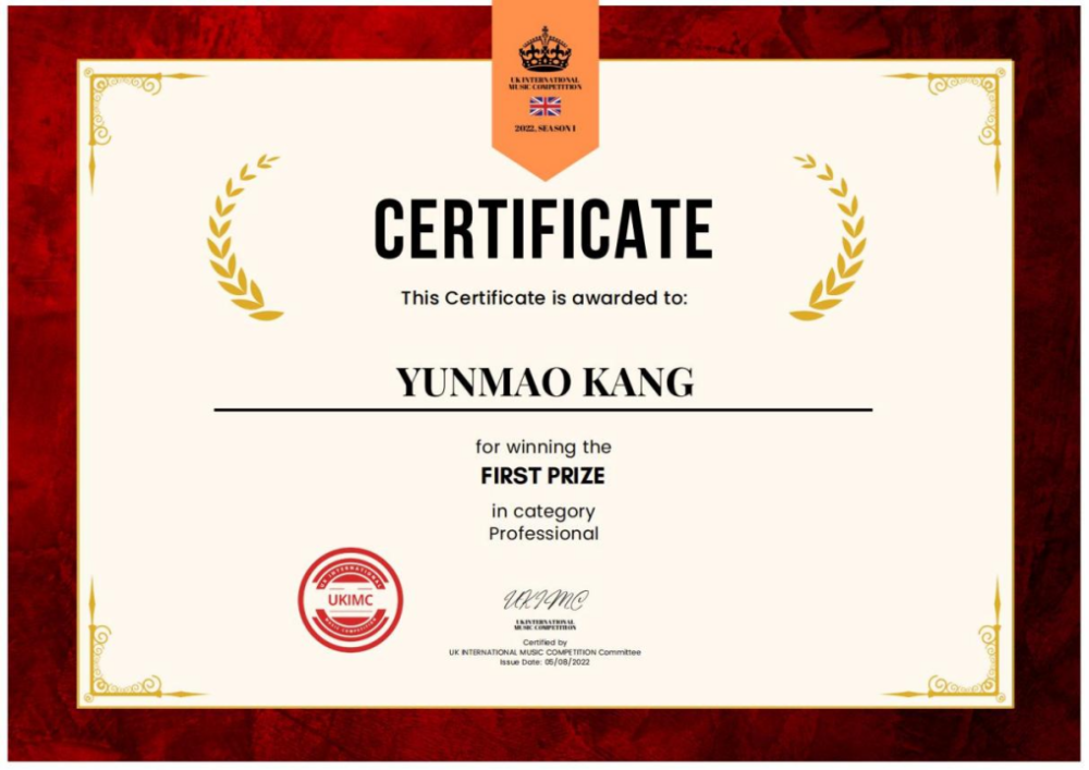 在英国国际音乐大赛中,管弦系小提琴专业学生康耘茂荣获专业组(无年龄限制) 第一名,在欧洲夏季音乐大赛中康耘茂荣获艺术家组(Virtuoso)金奖(第一名),指导教师:陈允教授、于兵教授。陈允教授、于兵教授分别获得两项赛事的优秀教师奖。