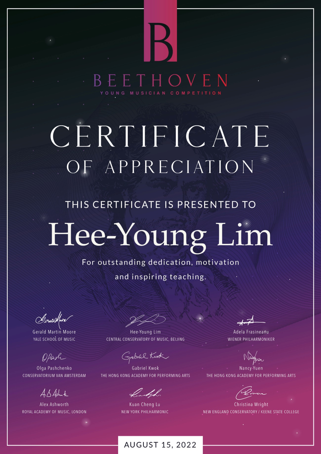贝多芬青年音乐家比赛(The Beethoven Young Musician Competition)设立于奥地利维也纳,是面向世界各地年轻音乐家的国际在线古典音乐比赛,包括钢琴、弦乐、声乐、室内乐四项,每项比赛分为不同的年龄类别。评委来自耶鲁音乐学院、阿姆斯特丹音乐学院、英国皇家音乐学院、香港演艺学院、纽约爱乐乐团、曼哈顿音乐学院、新英格兰音乐学院等。比赛旨在发现已经达到专业水平的年轻才俊和杰出表演者,并使其成为他们迈向国际职业生涯的一部分。