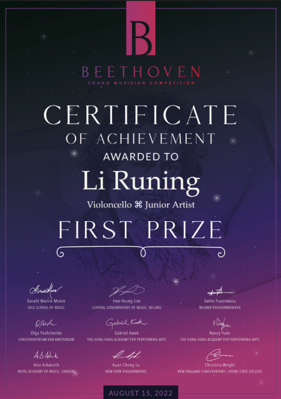 2022年贝多芬国际青年音乐家比赛(BEETHOVEN YOUNG MUSICIAN COMPETITION),大提琴少年艺术家组一等奖。