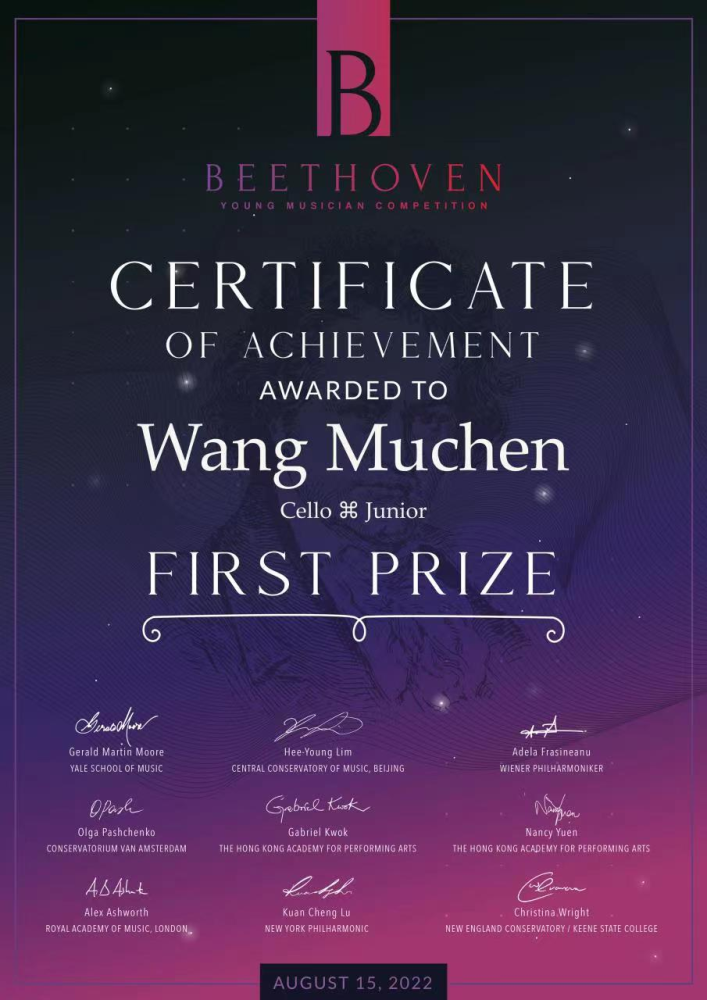 2022年荣获贝多芬国际青年音乐家比赛大提琴儿童组一等奖。