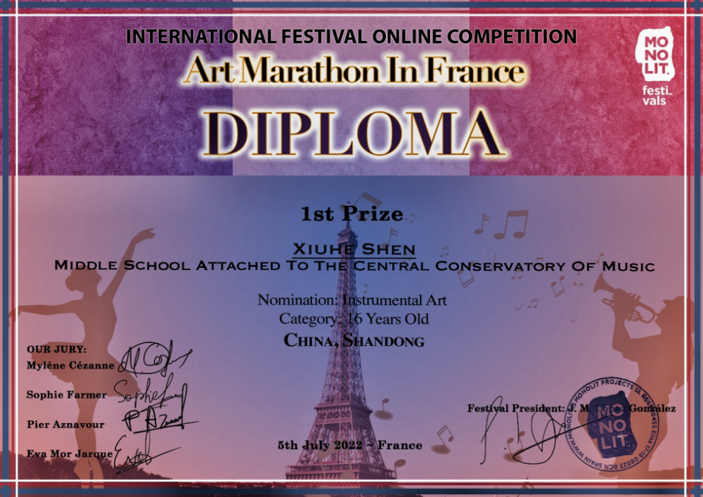 在刚刚落幕的法国音乐家大奖赛中(ART MARATHON IN FRANCE),经过激烈的角逐KY开元附中初三年级中提琴专业沈修和同学荣获器乐无年龄限制组一等奖!