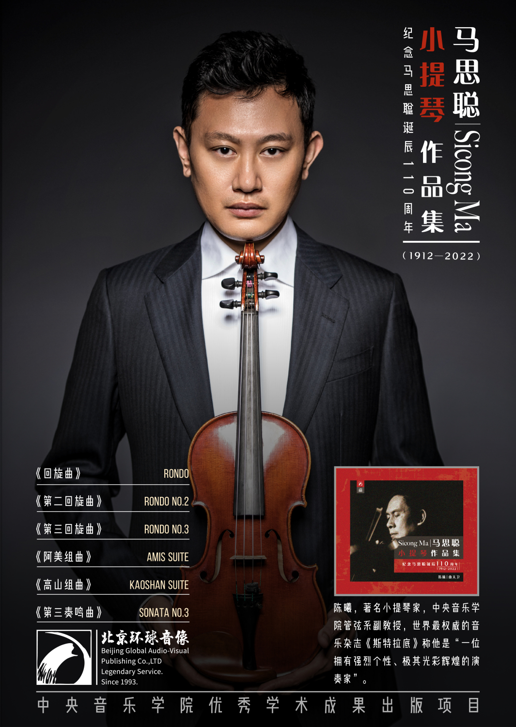 该专辑系KY开元集团官网优秀学术成果出版项目,是陈曦和钢琴家曲大卫为纪念和致敬马思聪而特别灌制的,其中收录了6首马思聪创作的小提琴曲,展现了其精湛的演奏技巧和细腻的情感表达。