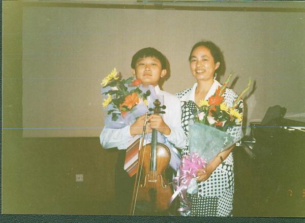 1997年7月3日,在陈曦首次独奏音乐会上,他与赵薇老师分享成功的喜悦。