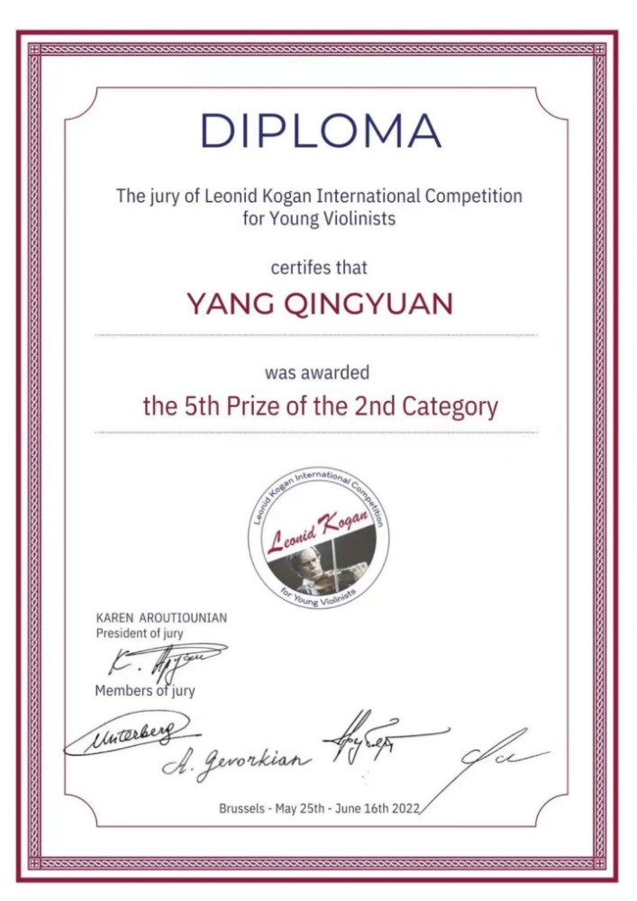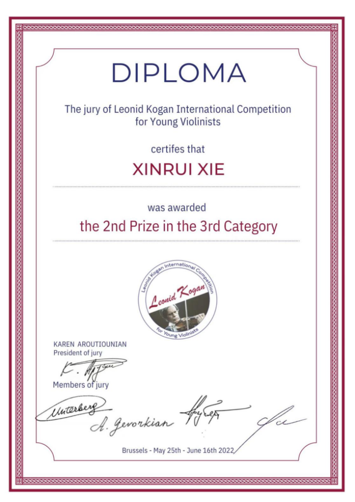 获奖经历:2021年在爱乐华生珠海横琴国际音乐比赛中获得专业组一等奖,2022年入围比利时萨伊青少年国际音乐比赛决赛,2022年获得第六届比利时柯冈国际青少年小提琴比赛第四名。